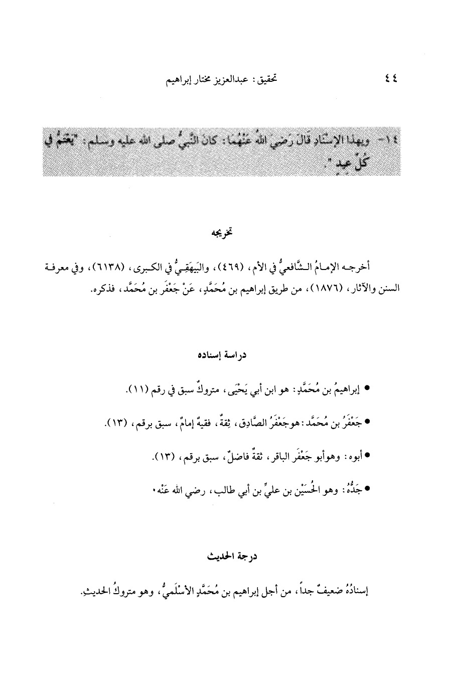14 - وبِهذا الإسْنَادِ قَالَ رَضِيَ اللهُ عَنْهُمَا: كانَ النَّبيُّ - صلى الله عليه وسلم -: "يَعْتَمُّ في كُلِّ عِيدٍ ".