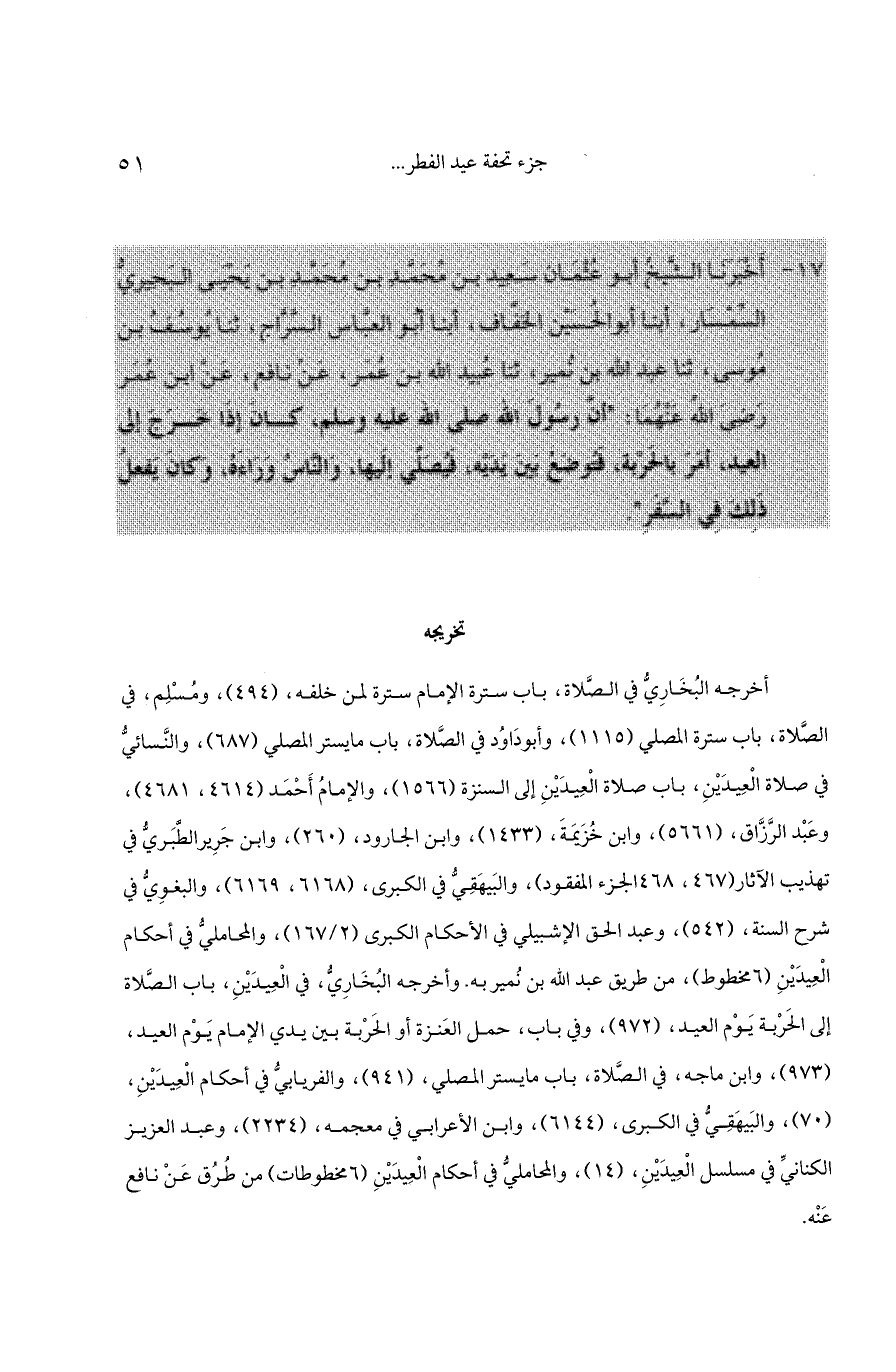 (973)، وابن ماجه، في الصَّلاة، باب مايستر المصلي، (941)، والفريابيُّ في أحكام الْعِيدَيْنِ، (70)، والبَيهَقِيُّ في الكبرى، (6144)، وابن الأعرابي في معجمه، (2234)، وعبد العزيز الكنانيِّ في مسلسل الْعِيدَيْنِ، (14)، والمحامليُّ في أحكام الْعِيدَيْنِ (6مخطوط) من طُرُق عَنْ نافع عَنْه.