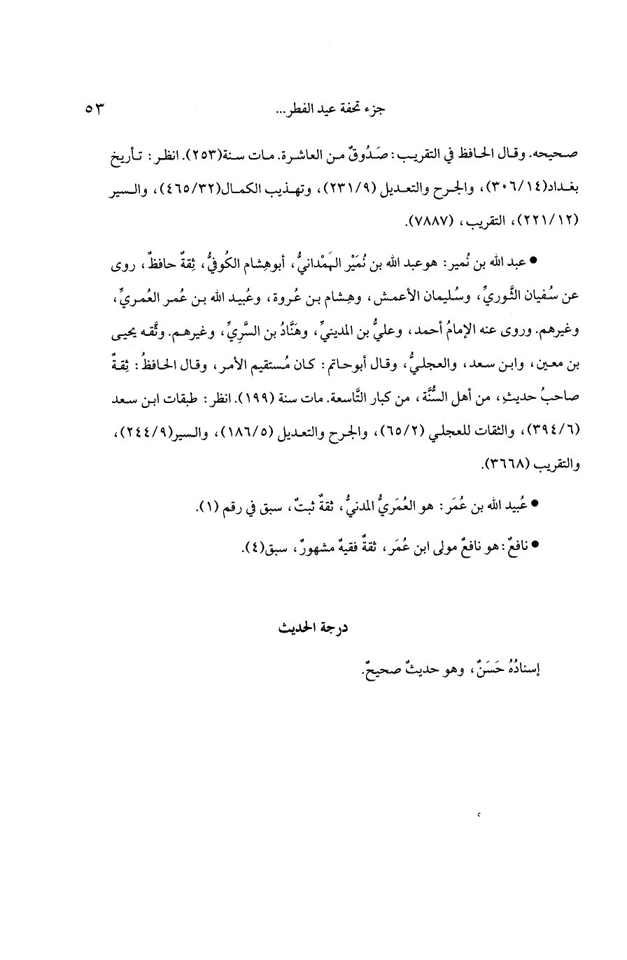 - عبد الله بن نُمير: هوعبد الله بن نُمَيْر الهَمْدانيُّ، أبوهِشام الكُوفيُّ، ثِقةٌ حافظٌ، روى عن سُفيان الثَّوريِّ، وسُليمان الأعمش، وهِشام بن عُروة، وعُبيد الله بن عُمر العُمريِّ، وغيرهم.