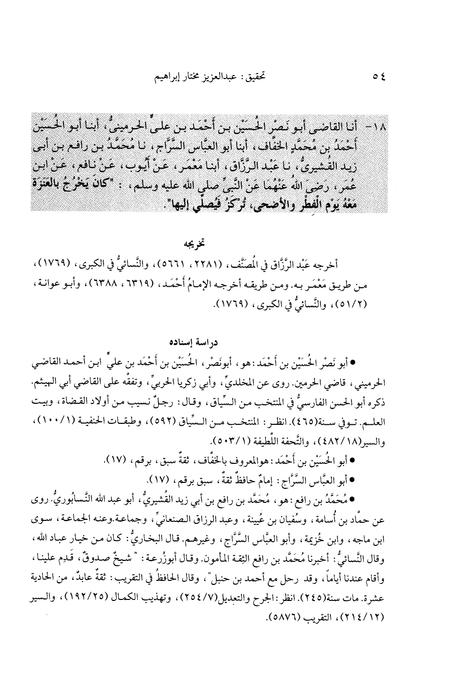 18 - أنا القاضي أبو نَصْر الحُسَيْن بن أَحْمَد بن عليٍّ الحرمينيُّ، أبنا أبو الحُسَيْن أَحْمَدُ بن مُحَمَّدٍ الخفَّاف، أبنا أبو العبَّاس السَّرَّاج، نا مُحَمَّدُ بن رافع بن أبي زيد القُشيريُّ، نا عَبْد الرَّزَّاق، أبنا مَعْمَر، عَنْ أَيُوب، عَنْ نافع، عَنْ ابن عُمَر، رَضِيَ اللهُ عَنْهُمَا عَنْ النَّبيِّ - صلى الله عليه وسلم -،: "كانَ يَخْرُجُ بِالعَنَزَةِ مَعْهُ يَوْم الْفِطْر والأضحى، تُرْكَزُ فَيُصلِّي إليها".