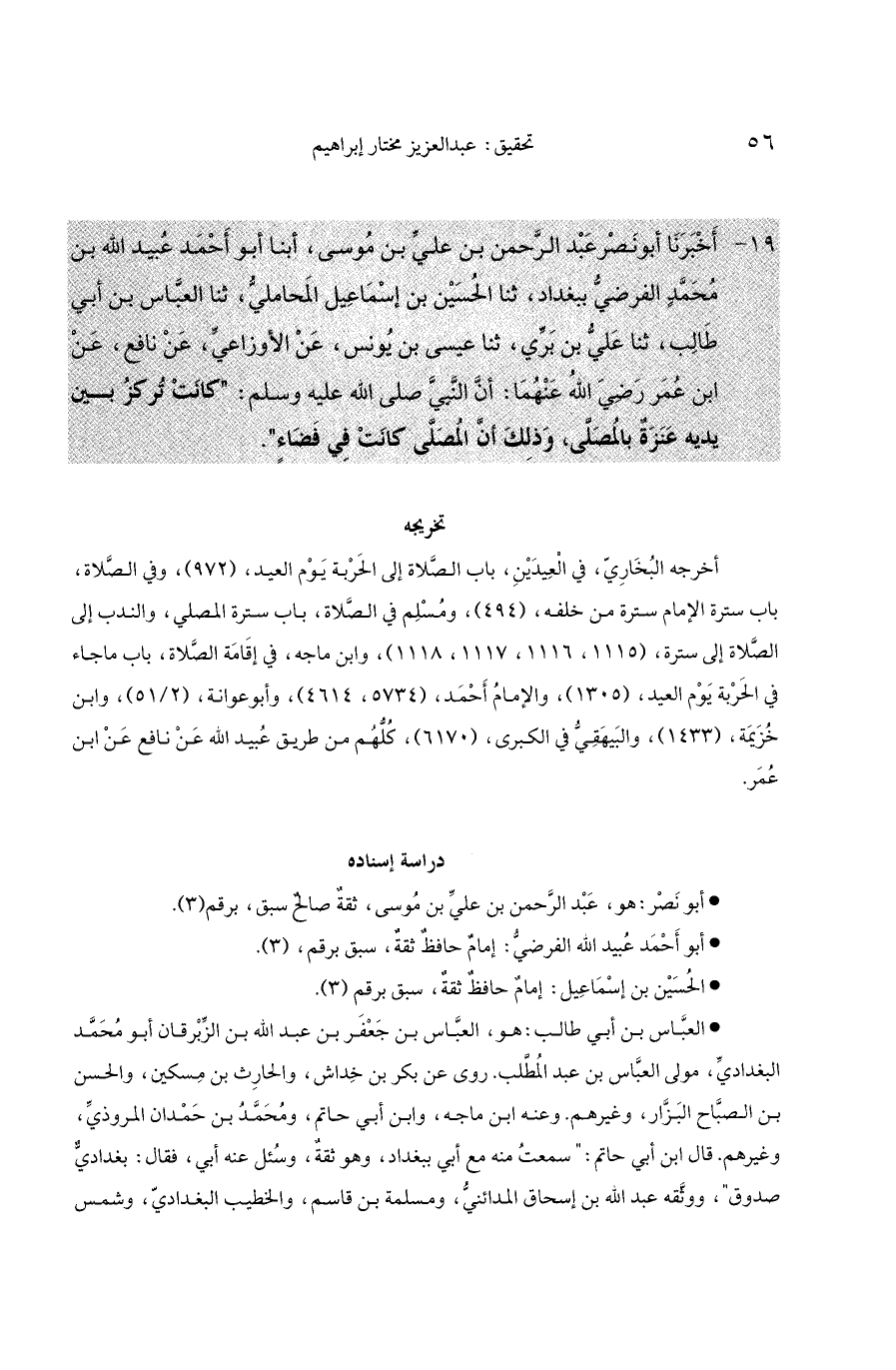 19 - أَخْبَرَنَا أبونَصْرعَبْد الرَّحمن بن عليِّ بن مُوسى، أبنا أبو أَحْمَد عُبيد الله بن مُحَمَّدٍ الفرضيُّ ببغداد، ثنا الحُسَيْن بن إسْمَاعِيل المَحامليُّ، ثنا العبَّاس بن أبي طَالِب، ثنا عَليُّ بن بَرِّي، ثنا عيسى بن يُونس، عَنْ الأوزاعيِّ، عَنْ نافع، عَنْ ابن عُمَر رَضِيَ اللهُ عَنْهُمَا: أنَّ النَّبِيَّ - صلى الله عليه وسلم -: "كانَتْ تُركزُ بين يديه عَنَزَةٌ بالمُصَلَّى، وَذلِكَ أنَّ المُصَلَّى كانَتْ فِي فَضَاءٍ".