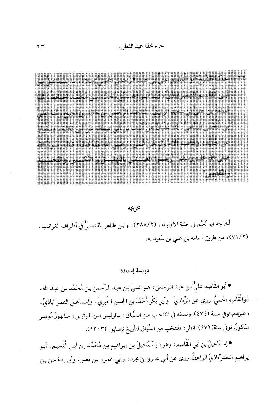 22 - حَدَّثنا الشَّيخُ أبو الْقَاسِم عليٍّ بن عبد الرَّحمن المحميُّ إملاءً، نا إسْمَاعِيلُ بن أبي الْقَاسِم النَصْرآباذيُّ، أبنا أبو الحُسَيْن مُحَمَّد بن مُحَمَّد الحافظُ، ثَنَا أسَامَةُ بن عليِّ بن سَعِيد الرَّازِيُّ، ثَنَا عبد الرَّحمن بن خَالِد بن نَجِيح، ثَنَا عليُّ بن الْحَسَن السَّاميُّ، ثنا سُفْيانُ عَنْ أَيُوب بن أبي تميمَة، عَنْ أبي قِلابة، وسُفْيانُ عَنْ حُمَيْد، وعَاصِمٍ الأحْوَلِ عَنْ أنَسِ، رَضِيَ اللهُ عَنْهُ قَالَ: قَالَ رسُولُ الله - صلى الله عليه وسلم -: "زَيِّنُوا الْعِيدَيْنِ بِالتَّهلِيلِ وَالتَّكبِيرِ، والتَّحَمِيْدِ والتَّقدِيسِ".