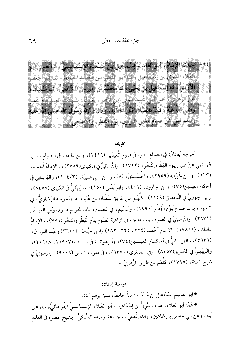 24 - حَدَّثنا الإمَامُ، أبو الْقَاسِمْ إسْمَاعِيل بن مَسْعَدة الإسْمَاعِيليُّ، ثنا عَمِّي أبو العَلاء السَّريُّ بن إسْمَاعِيل، ثنا أبو النَّضْر بن مُحَمَّدٍ الحافظُ، ثنا أبو جَعْفَر الأزْدِيُّ، ثنا إسْمَاعِيل بن يَحْيَى، ثنا مُحَمَّدُ ابن إدريس الشَّافعيُّ، ثنا سُفْيانُ، عَنْ الزُّهريِّ، عَنْ أبي عُبيد مَولى ابن أزْهَر، يَقُولُ: شَهِدْتُ العِيدَ مَعْ عُمَر رَضِيَ اللهُ عَنْهُ، فَبَدَأ بالصَّلاةِ قَبْلَ الخُطْبَة، وَقَالَ: "إنَّ رَسُولَ الله - صلى الله عليه وسلم - نَهى عَنْ صِيامِ هَذَينِ اليَوْمينِ، يَوْم الْفِطْر، وَالأضْحى".