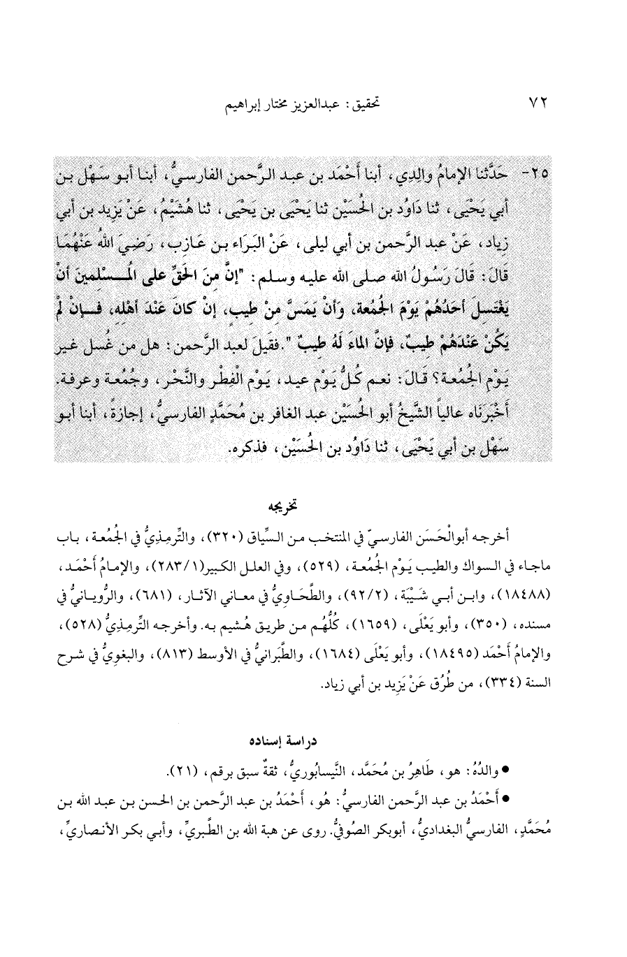 25 - حَدَّثنا الإمامُ والِدِي، أبنا أَحْمَد بن عبد الرَّحمن الفارسيُّ، أبنا أبو سَهْل بن أبي يَحْيَى، ثنا دَاوُد بن الحُسَيْن ثنا يَحْيَى بن يَحْيَى، ثنا هُشَيْمُ، عَنْ يَزِيد بن أبي زِياد، عَنْ عبد الرَّحمن بن أبي ليلى، عَنْ البَرَاء بن عَازِب، رَضِيَ اللهُ عَنْهُمَا قَالَ: قَالَ رَسُولُ الله - صلى الله عليه وسلم -: "إنَّ مِنَ الحَقِّ على المُسْلِمينَ أنْ يَغْتَسِلَ أحَدُهُمْ يَوْمَ الجُمُعة، وَأنْ يَمَسَّ مِنْ طِيبٍ، إنْ كانَ عَنْدَ أهْلِهِ، فإنْ لمْ يَكُنْ عَنْدَهُمْ طِيبٌ، فإنَّ الماءَ لَهُ طِيبٌ ".