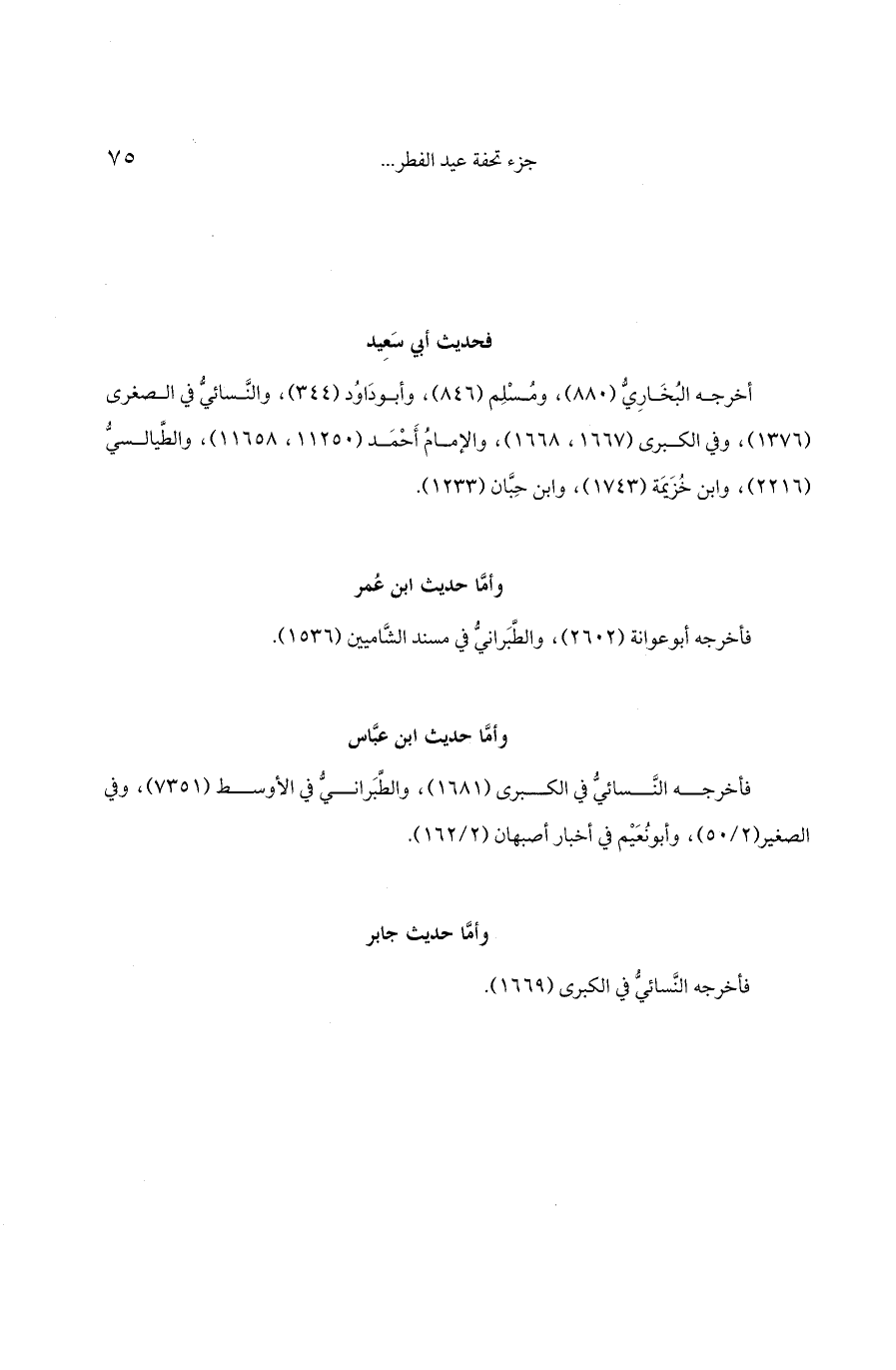 أخرجه البُخَارِيُّ (880)،ومُسْلِم (846)،وأبودَاوُد (344)، والنَّسائيُّ في الصغرى (1376)،وفي الكبرى (1667، 1668)، والإمامُ أَحْمَد (11250، 11658)، والطَّيالسيُّ (2216)، وابن خُزَيمَة