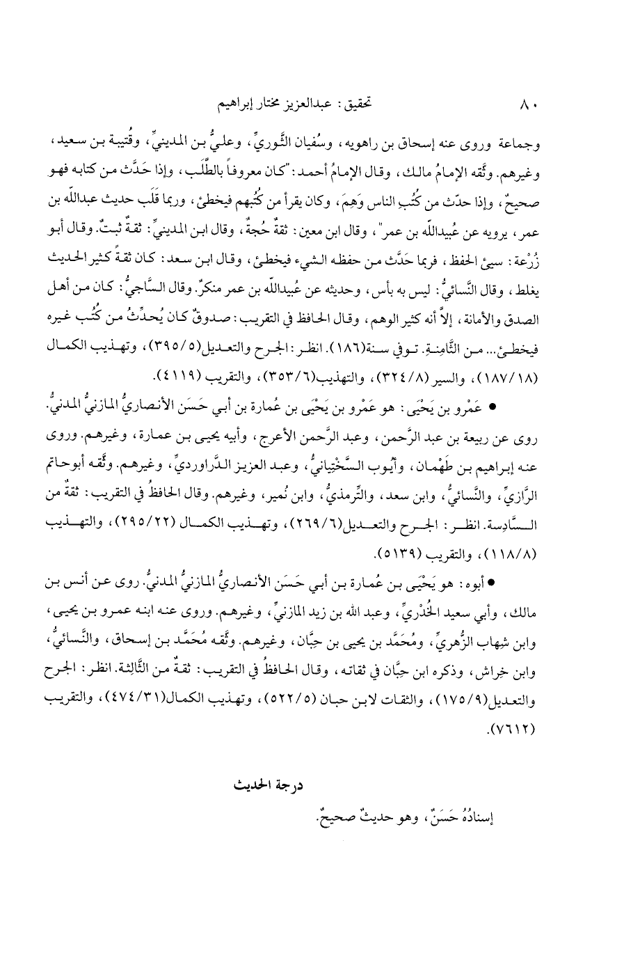 وثَّقه مُحَمَّد بن إسحاق، والنَّسائيُّ، وابن خِراش، وذكره ابن حِبَّان في ثقاته، وقال الحافظُ في التقريب: ثقةٌ من الثَّالِثة. انظر: الجرح والتعديل (9/ 175)،والثقات لابن حبان (5/ 522)، وتهذيب الكمال (31/ 474)،والتقريب (7612).