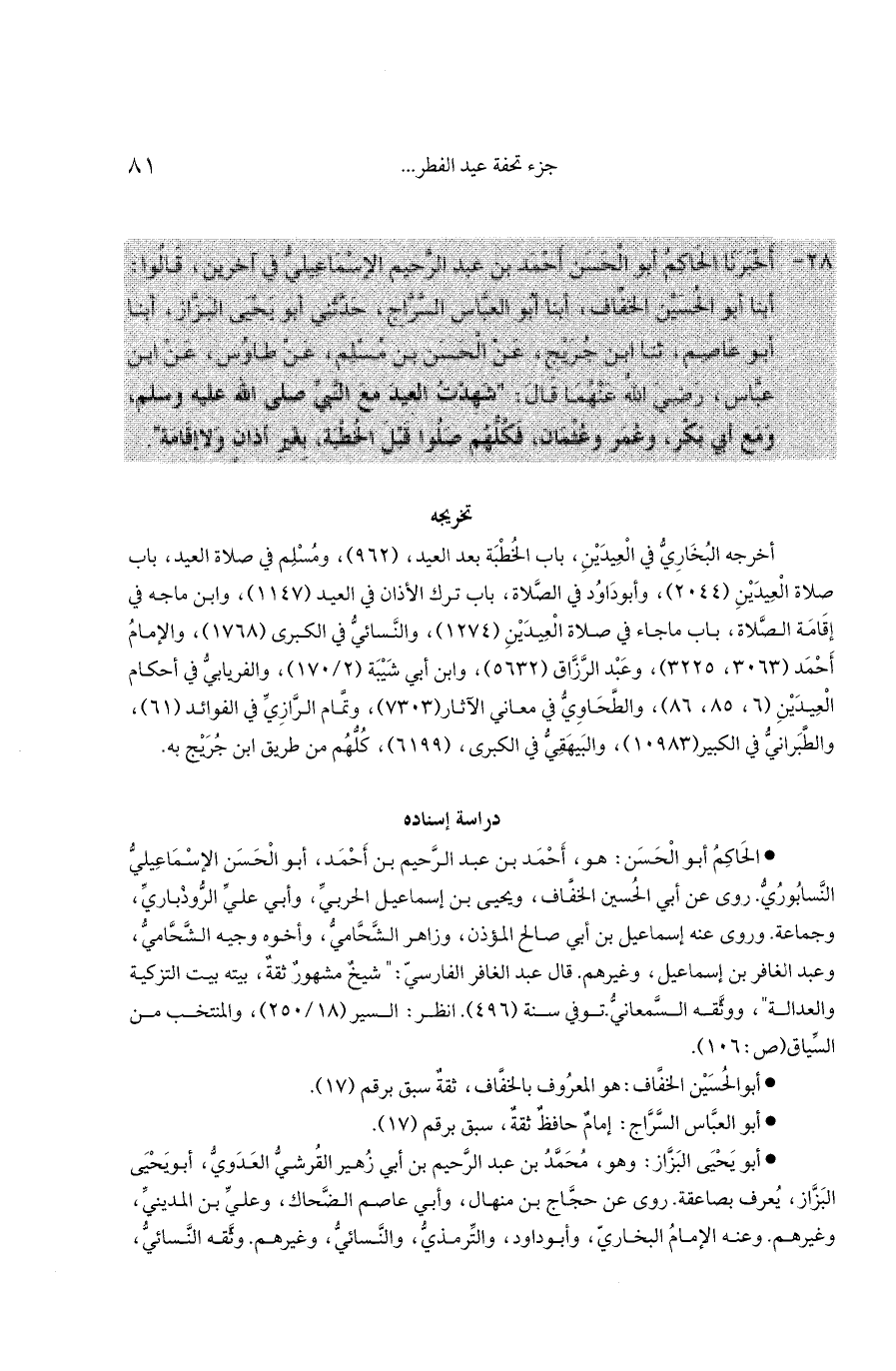 28 - أَخْبَرَنَا الحَاكِمُ أبو الْحَسَن أَحْمَد بن عبد الرَّحيم الإسْمَاعِيليُّ في آخرين، قَالُوا: أبنا أبو الحُسَيْن الخفَّاف، أبنا أبُو العبَّاس السَّرَّاج، حَدَّثَنِي أبو يَحْيَى البَزَّاز، أبنا أبو عَاصِم، ثنا ابن جُرَيْج، عَنْ الْحَسَن بن مُسْلِم، عَنْ طاوُس، عَنْ ابن عبَّاس، رَضِيَ اللهُ عَنْهُمَا قَالَ: "شَهِدْتُ العِيدَ معَ النَّبيِّ - صلى الله عليه وسلم -، وَمَع أبي بَكْر، وعُمَر وعُثْمَان، فَكُلُّهُم صَلُوا قَبْلَ الخُطْبَة، بِغْيرِ أذانٍ وَلا إقَامَة".