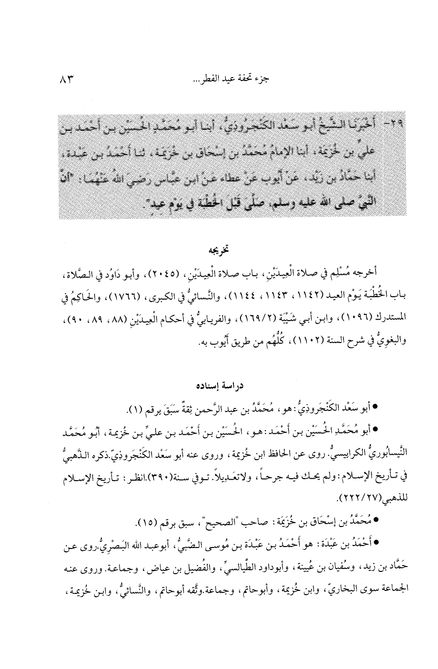 29 - أَخْبَرَنَا الشَّيخُ أبو سَعْد الكَنْجَرُوذِيُّ، أبنا أبو مُحَمَّدٍ الحُسَيْن بن أَحْمَد بن عليٍّ بن خُزَيمَة، أبنا الإمامُ مُحَمَّدُ بن إسْحَاق بن خُزَيمَة، ثنا أَحْمَدُ بن عَبْدة، أبنا حَمَّادُ بن زَيْد، عَنْ أَيُوب عَنْ عطاء عَنْ ابن عبَّاس رَضِيَ اللهُ عَنْهُمَا: "أنَّ النَّبيَّ - صلى الله عليه وسلم -، صَلَّىَ قَبْلَ الخُطْبَة في يَوْمِ عِيدٍ".