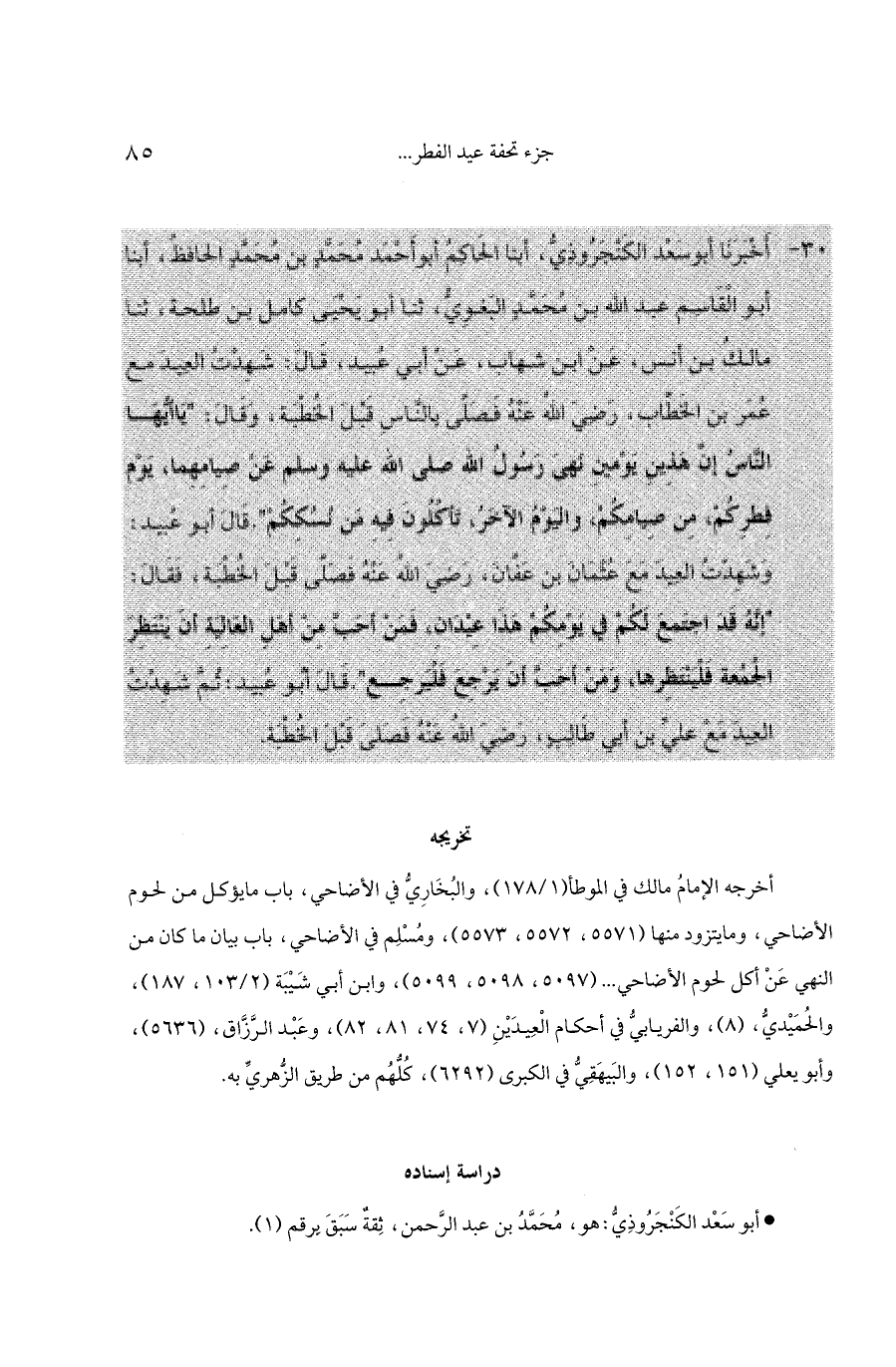 30 - أَخْبَرَنَا أبوسَعْد الكَنْجَرُوذِيُّ، أبنا الحَاكِمُ أبوأَحْمَد مُحَمَّدٍ بن مُحَمَّدٍ الحافظُ، أبنا أبو الْقَاسِم عبد الله بن مُحَمَّدٍ البَغوِيُّ، ثنا أبو يَحْيَى كامل بن طلحة، ثنا مالكُ بن أنس، عَنْ ابن شهاب، عَنْ أبي عُبيد، قَالَ: شَهِدْتُ العِيدَ مع عُمَر بن الخَطَّاب، رَضِيَ اللهُ عَنْهُ فَصَلَّى بِالنَّاسِ قَبْلَ الخُطْبَة، وَقَالَ: "يَا أيُّهَا النَّاسُ إنَّ هَذِينِ يَوْمينِ نَهىَ رَسُولُ الله - صلى الله عليه وسلم - عَنْ صِيامِهِما، يَوْم فِطرِكُمْ، مِن صِيامِكُمْ، واليَوْمُ الآخَرُ، تَأكُلُونَ فِيهِ مَن نُسُكِكُمْ".