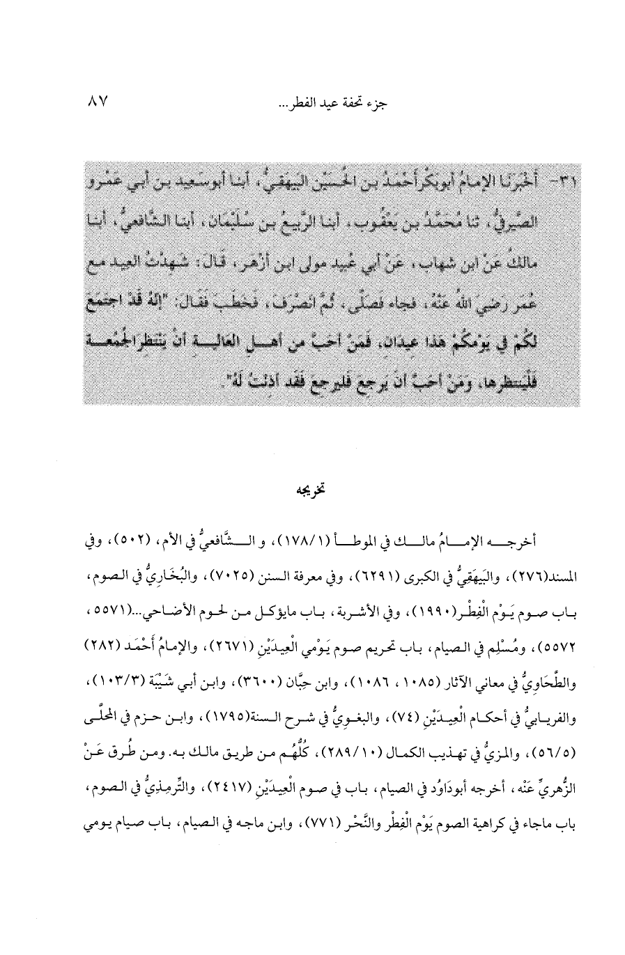 31 - أَخْبَرَنَا الإمامُ أبوبَكْرأَحْمَدُ بن الحُسَيْن البَيهَقِيُّ، أبنا أبوسَعِيد بن أبي عَمْرو الصَّيرفيُّ، ثنا مُحَمَّدُ بن يَعْقُوب، أبنا الرَّبيعُ بن سُلَيْمَان، أبنا الشَّافعيُّ، أبنا مالكُ عَنْ ابن شهاب، عَنْ أبي عُبيد مولى ابن أزْهَر، قَالَ: شَهِدْتُ العِيد مع عُمَر رَضِيَ اللهُ عَنْهُ، فجاء فَصَلَّى، ثُمَّ انَصْرَفَ، فَخَطَبَ فَقَالَ: "إنّهُ قَدْ اجتَمَعَ لكُمْ في يَوْمكُمْ هَذا عِيدَانِ، فَمَنْ أحَبَّ من أهلِ العَاليةِ أنْ يَنْتَظِرَالجُمُعة فَلْيَنتظرها، وَمَنْ أحَبَّ أنَ يَرجِعَ فَليرجِعَ فَقَد أذِنْتُ لَهُ".