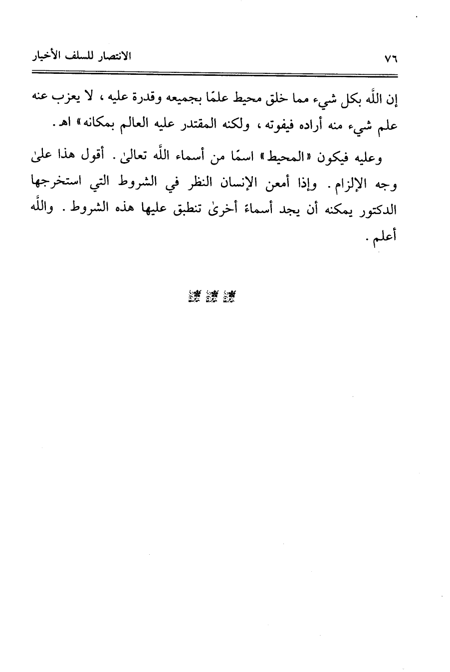 وعليه فيكون «المحيط» اسما من أسماء الله تعالى. أقول هذا على وجه الإلزام. وإذا أمعن الإنسان النظر في الشروط التي استخرجها الدكتور يمكنه أن يجد أسماء أخرى تنطبق عليها هذه الشروط. والله أعلم.