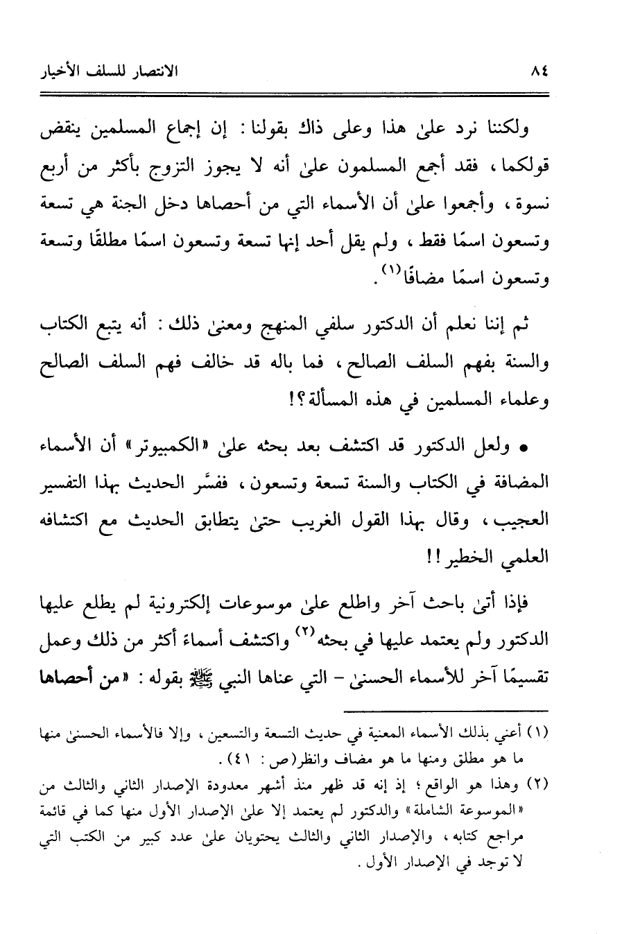 ولكننا نرد على هذا وعلى ذاك بقولنا: إن إجماع المسلمين ينقض قولكما، فقد أجمع المسلمون على أنه لا يجوز التزوج بأكثر من أربع نسوة، وأجمعوا على أن الأسماء التي مَن أحصاها دخل الجنة هي تسعة وتسعون اسما فقط، ولم يقل أحد إنها تسعة وتسعون اسما مطلقا وتسعة وتسعون اسما مضافا (¬1).