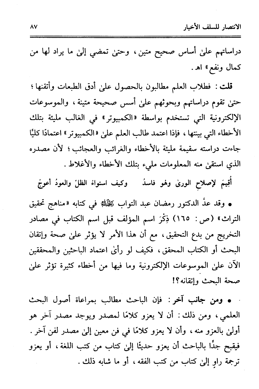 قلتُ: فطلاب العلم مطالبون بالحصول على أدق الطبعات وأتقنها؛ حتى تقوم دراساتهم وبحوثهم على أسس صحيحة متينة، والموسوعات الإلكترونية التي تستخدم بواسطة «الكمبيوتر» في الغالب مليئة بتلك الأخطاء التي بيَّنتها، فإذا اعتمد طالب العلم على «الكمبيوتر» اعتمادًا كليًّا جاءت دراسته سقيمة مليئة بالأخطاء والغرائب والعجائب؛ لأنَّ مصدره الذي استقى منه المعلومات مليءٌ بتلك الأخطاء والأغلاط.