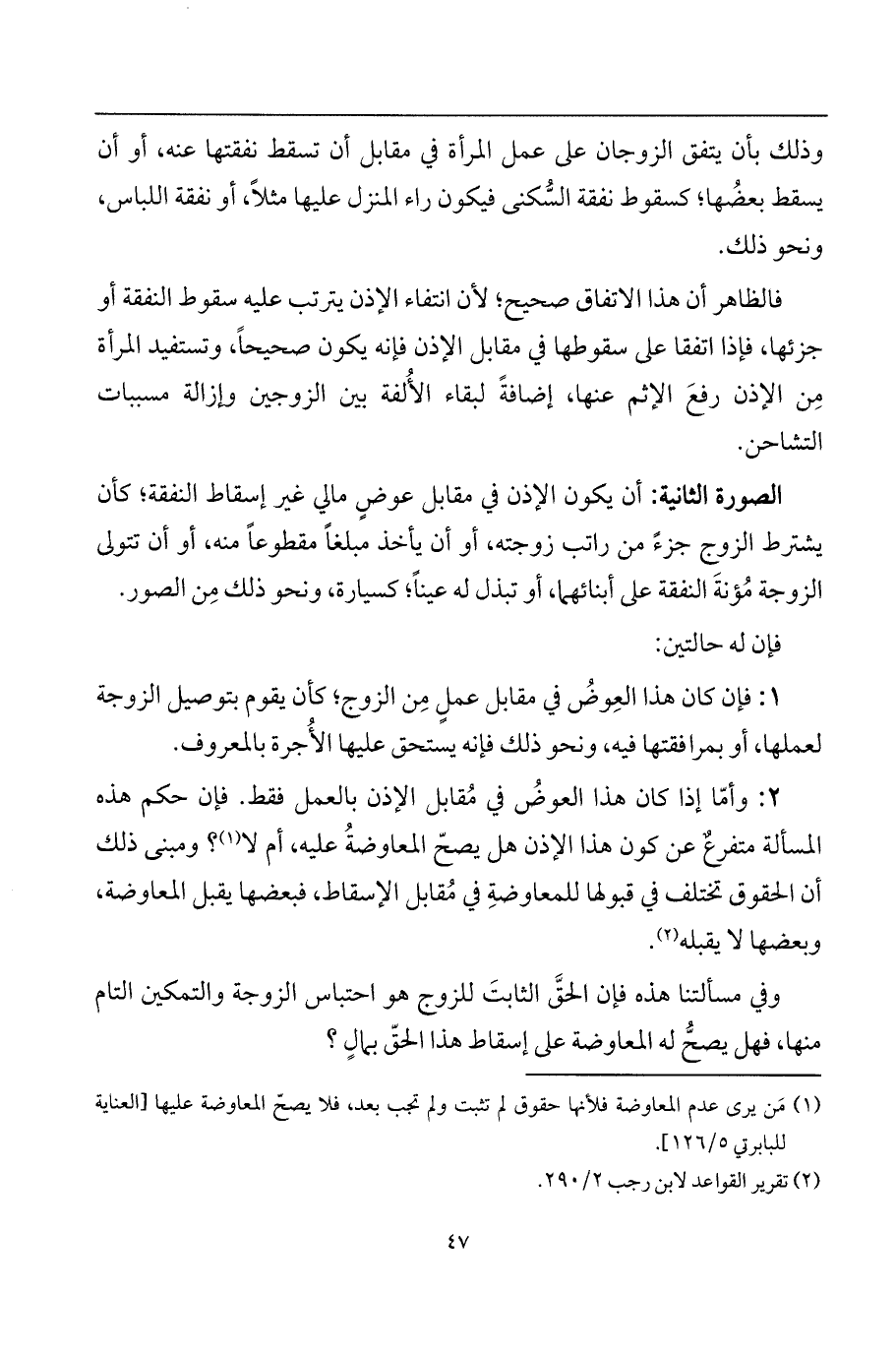 فالظاهر أن هذا الاتفاق صحيح; لأن انتفاء الإذن يترتب عليه سقوط النفقة أو جزئها, فإذا اتفقا على سقوطها في مقابل الإذن فإنه يكون صحيحًا, وتستفيد المرأة مِن الإذن رفعَ الإثم عنها, إضافةً لبقاء الأُلفة بين الزوجين وإزالة مسببات التشاحن.