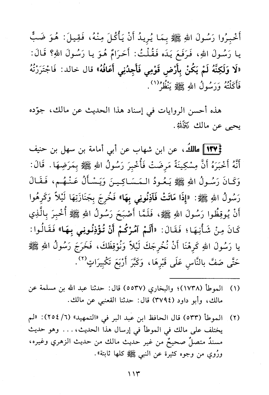 (¬2) الموطأ (533) قال الحافظ ابن عبد البر في "التمهيد" (6/ 254): "لم يختلف على مالك في الموطأ في إرسال هذا الحديث، . . . وهو حديث مسندٌ متصلٌ صحيحٌ من غير حديث مالك من حديث الزهري وغيره، ورُوي من وجوه كثيرة عن النبي - صلى الله عليه وسلم - كلها ثابتة".