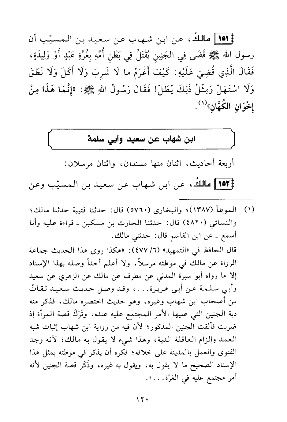 152 - مالكُ، عن ابن شهاب عن سعيد بن المسيّب وعن