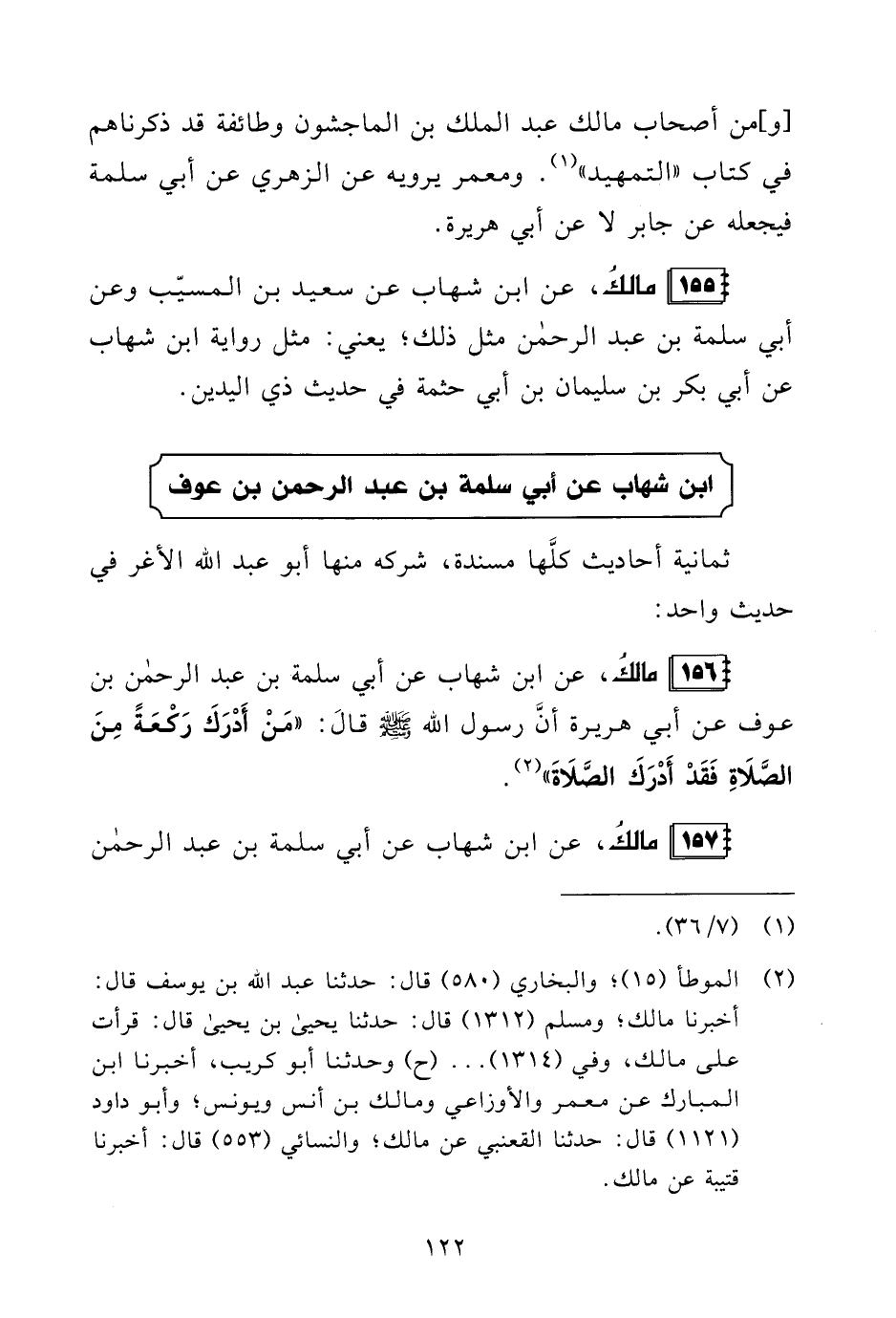 156 - مالكُ، عن ابن شهاب عن أبي سلمة بن عبد الرحمن بن عوف عن أبي هريرة أنَّ رسول الله - صلى الله عليه وسلم - قالَ: "مَنْ أَدْرَكَ رَكعَةً مِنَ الصَّلَاةِ فَقَدْ أدْرَكَ الصَّلَاة" (¬2).