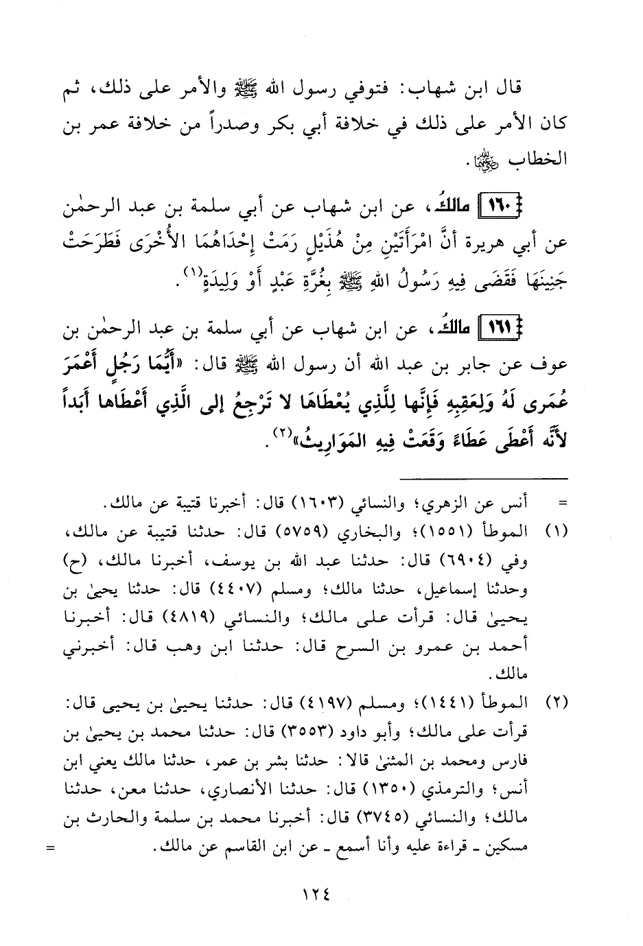 160 - مالكُ، عن ابن شهاب عن أبي سلمة بن عبد الرحمن عن أبي هريرة أنَّ امْرَأَتَيْنِ مِنْ هُذَيْلٍ رَمَتْ إِحْدَاهُمَا الأُخْرَى فَطَرَحَتْ جَنِينَهَا فَقَضى فِيهِ رَسُولُ اللهِ - صلى الله عليه وسلم - بِغُرَّةِ عَبْدٍ أَوْ وَلِيدَةٍ (¬1).
