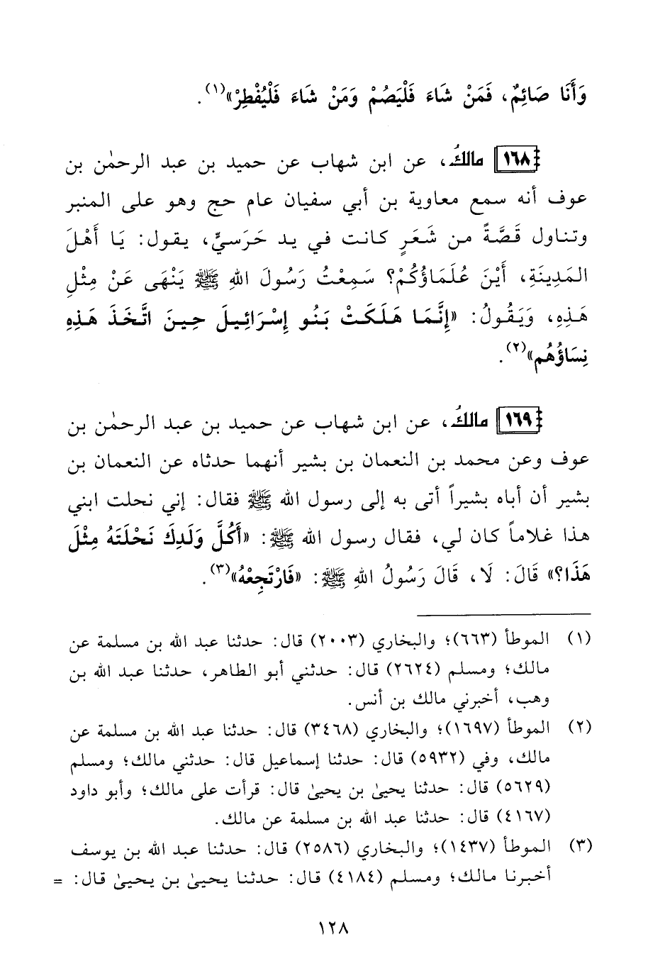 169 - مالكُ، عن ابن شهاب عن حميد بن عبد الرحمن بن عوف وعن محمد بن النعمان بن بشير أنهما حدثاه عن النعمان بن بشير أن أباه بشيرًا أتى به إلى رسول الله - صلى الله عليه وسلم - فقال: إني نحلت ابني هذا غلامًا كان لي، فقال رسول الله - صلى الله عليه وسلم -: "أَكُلَّ وَلَدِكَ نَحْلَتَهُ مِثْلَ هَذَا؟ " قَالَ: لَا، قَالَ رَسُولُ الله - صلى الله عليه وسلم -: "فَارْتَجِعْهُ" (¬3).