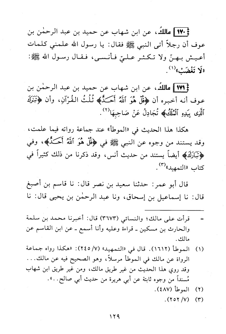 171 - مالكُ، عن ابن شهاب عن حميد بن عبد الرحمن بن عوف أنه أخبره أن {قُلْ هُوَ اللَّهُ أَحَدٌ} ثُلُثُ القُرْآنِ، وأن {تَبَارَكَ الَّذِي بِيَدِهِ الْمُلْكُ} تُجَادِلُ عَنْ صَاحِبِهَا (¬2).