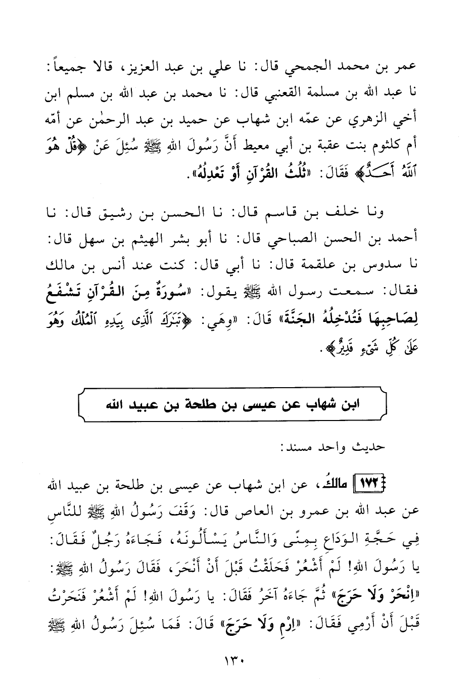 172 - مالكُ، عن ابن شهاب عن عيسى بن طلحة بن عبيد الله عن عبد الله بن عمرو بن العاص قال: وَقَفَ رَسُولُ اللهِ - صلى الله عليه وسلم - للنَّاسِ فِي حَجَّةِ الوَدَاع بِمِنًى وَالنَّاسُ يَسْأَلُونَهُ، فَجَاءَهُ رَجُلٌ فَقَالَ: يا رَسُولَ اللهِ! لَمْ أَشْعُرْ فَحَلَقْتُ قَبْلَ أَنْ أَنْحَرَ، فَقَال رَسُول الله - صلى الله عليه وسلم -: "اِنْحَرْ وَلَا حَرَجَ" ثُمَّ جَاءَهُ آخَرُ فَقَالَ: يا رَسُولَ اللهِ! لَمْ أَشْعُرْ فَنَحَرْتُ قَبْلَ أَنْ أَرْمِي فَقَالَ: "اِرْمِ وَلَا حَرَجَ" قَالَ: فَمَا سُئِلَ رَسُولُ الله - صلى الله عليه وسلم -