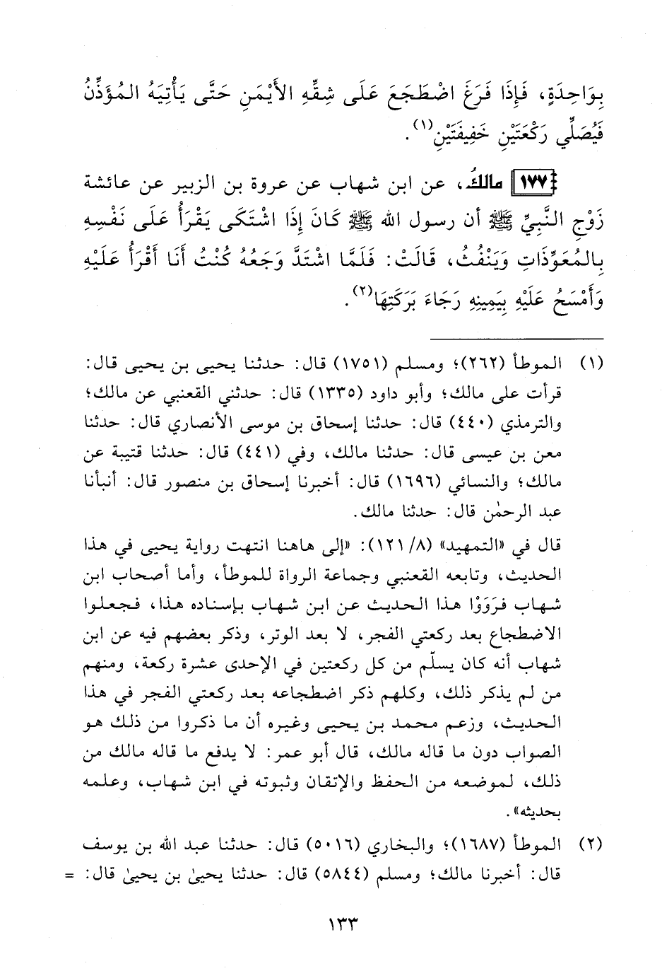 قال في "التمهيد" (8/ 121): "إلى ها هنا انتهت رواية يحيى في هذا الحديث، وتابعه القعنبي وجماعة الرواة للموطأ، وأما أصحاب ابن شهاب فرَوَوْا هذا الحديث عن ابن شهاب بإسناده هذا، فجعلوا الاضطجاع بعد ركعتي الفجر، لا بعد الوتر، وذكر بعضهم فيه عن ابن شهاب أنه كان يسلّم من كل ركعتين في الإحدى عشرة ركعة، ومنهم من لم يذكر ذلك، وكلهم ذكر اضطجاعه بعد ركعتي الفجر في هذا الحديث، وزعم محمد بن يحيى وغيره أن ما ذكروا من ذلك هو الصواب دون ما قاله مالك، قال أبو عمر: لا يدفع ما قاله مالك من ذلك، لموضعه من الحفظ والإتقان وثبوته في ابن شهاب، وعلمه بحديثه".
