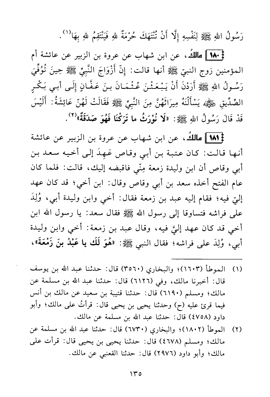 180 - مالكُ، عن ابن شهاب عن عروة بن الزبير عن عائشة أم المؤمنين زوج النبيّ - صلى الله عليه وسلم - أنها قالت: إِنّ أَزْوَاجَ النَّبِيِّ - صلى الله عليه وسلم - حِينَ تُوُفِّيَ رَسُولُ اللهِ - صلى الله عليه وسلم - أَرَدْنَ أَنْ يَبْعَثْنَ عُثْمَانَ بنَ عَفَّانٍ إِلَى أبي بَكْرٍ الصِّدِّيقِ -رضي الله عنه- يَسْأَلْنَهُ مِيرَاثَهُنَّ مِنَ النَّبِيِّ - صلى الله عليه وسلم - فَقَالَتْ لَهُنّ عَائِشَةُ: أَلَيْسَ قَدْ قَالَ رَسُولُ اللهِ - صلى الله عليه وسلم -: "لَا نُوْرَثُ ما تَرَكْنَا فَهُوَ صَدَقةٌ" (¬2).
