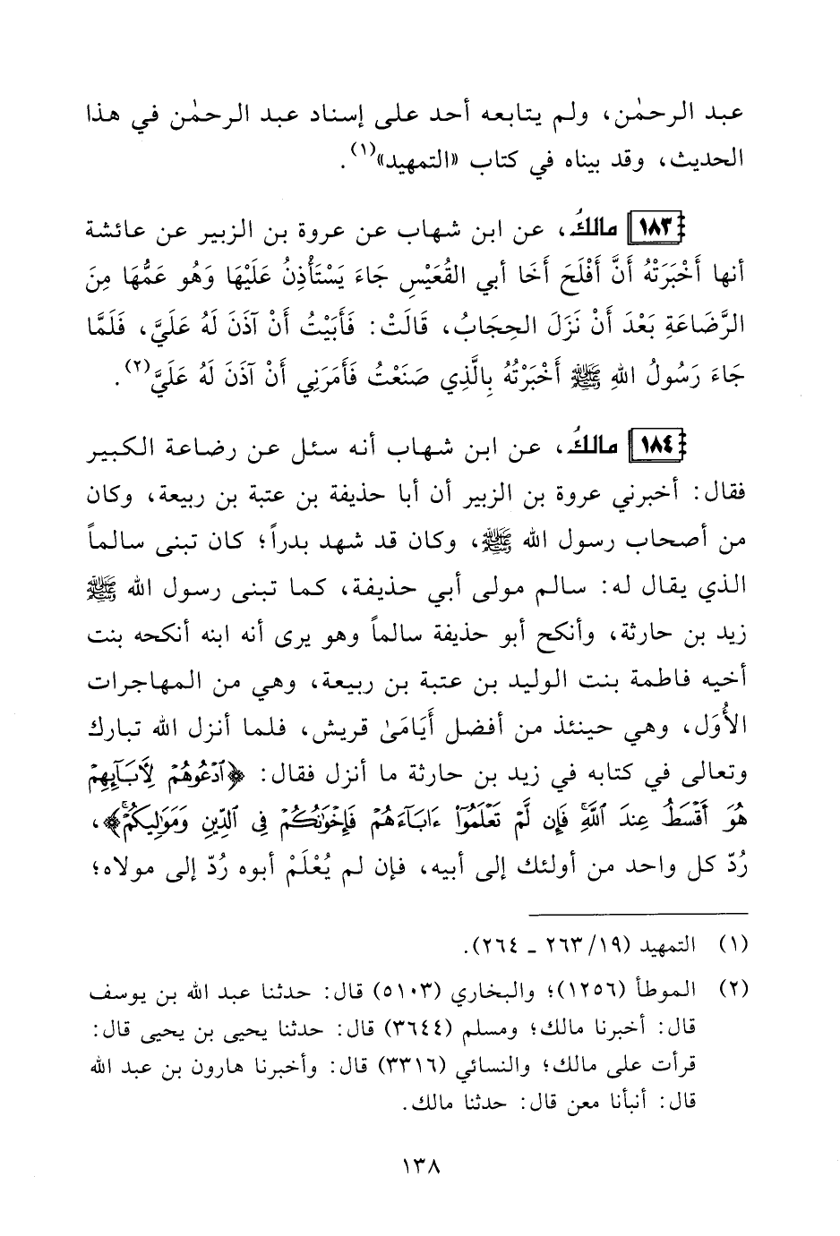 184 - مالكُ، عن ابن شهاب أنه سئل عن رضاعة الكبير فقال: أخبرني عروة بن الزبير أن أبا حذيفة بن عتبة بن ربيعة، وكان من أصحاب رسول الله - صلى الله عليه وسلم -، وكان قد شهد بدرًا؛ كان تبنى سالمًا الذي يقال له: سالم مولى أبي حذيفة، كما تبنى رسول الله - صلى الله عليه وسلم - زيد بن حارثة، وأنكح أبو حذيفة سالمًا وهو يرى أنه ابنه أنكحه بنت أخيه فاطمة بنت الوليد بن عتبة بن ربيعة، وهي من المهاجرات الأُوَل، وهي حينئذ من أفضل أَيَامَى قريش، فلما أنزل الله تبارك وتعالى في كتابه في زيد بن حارثة ما أنزل فقال: {ادْعُوهُمْ لِآبَائِهِمْ هُوَ أَقْسَطُ عِنْدَ اللَّهِ فَإِنْ لَمْ تَعْلَمُوا آبَاءَهُمْ فَإِخْوَانُكُمْ فِي الدِّينِ وَمَوَالِيكُمْ} , رُدّ كل واحد من أولئك إلى أبيه، فإن لم يُعْلَمْ أبوه رُدّ إلى مولاه؛