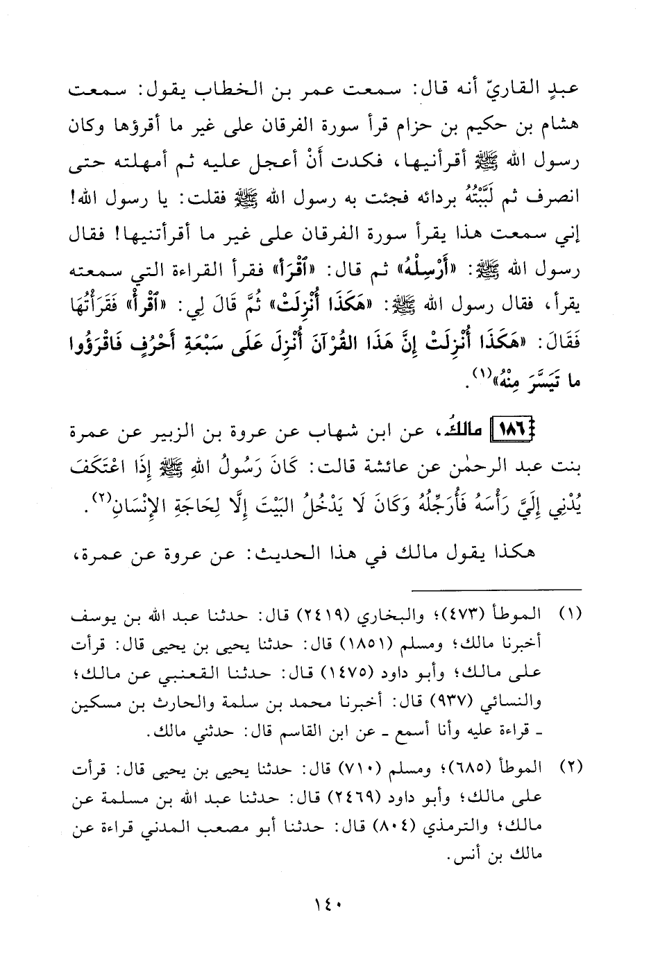186 - مالكُ، عن ابن شهاب عن عروة بن الزبير عن عمرة بنت عبد الرحمن عن عائشة قالت: كَانَ رَسُولُ اللهِ - صلى الله عليه وسلم - إِذَا اعْتَكَفَ يُدْنِي إِلَيَّ رَأْسَهُ فَأُرَجِّلُهُ وَكَانَ لَا يَدْخُلُ البَيْتَ إِلَّا لِحَاجَةِ الإِنْسَانِ (¬2).
