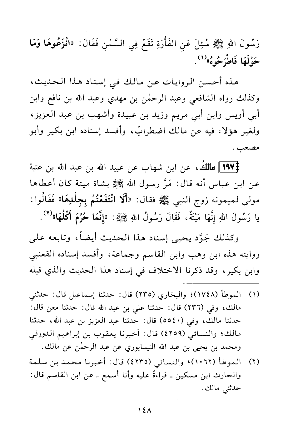197 - مالكُ، عن ابن شهاب عن عبيد الله بن عبد الله بن عتبة عن ابن عباس أنه قال: مَرَّ رسول الله - صلى الله عليه وسلم - بشاة ميتة كان أعطاها مولى لميمونة زوج النبي - صلى الله عليه وسلم - فقال: "ألا انْتَفَعْتُمُ بِجِلْدِهَا" فَقَالُوا: يا رَسُولَ اللهِ إِنَّهَا مَيْتَةٌ، فَقَالَ رَسُولُ اللهِ - صلى الله عليه وسلم -: "إِنَّمَا حُرِّمَ أَكْلُهَا" (¬2).