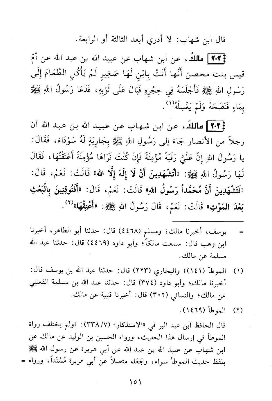 203 - مالكُ، عن ابن شهاب عن عبيد الله بن عبد الله أن رجلًا من الأنصار جَاءَ إلى رَسُولِ اللهِ - صلى الله عليه وسلم - بِجَارِيَةٍ لَهُ سَوْدَاءَ، فَقَالَ: يا رَسُولَ اللهِ إِنّ عَلَيَّ رَقَبَةً مُؤْمِنَةً فَإِنْ كُنْتَ تَرَاهَا مُؤْمِنَةً أَعْتَقْتُهَا، فَقَالَ لَهَا رَسُولُ اللهِ - صلى الله عليه وسلم -: "أَتَشْهَدِينَ أَنْ لَا إِلَهَ إِلَّا الله" قَالَتْ: نَعَمْ، قَالَ: "فَتَشْهَدِينَ أَنَّ مُحَمَّدًا رَسُولُ اللهِ" قَالَتْ: نَعَمْ، قَالَ: "أَفتُوقِنِينَ بِالْبَعْثِ بَعْدَ المَوْتِ" قَالَتْ؛ نَعَمْ، قَالَ رَسُولُ اللهِ - صلى الله عليه وسلم -؛ "أَعْتِقْهَا" (¬2).