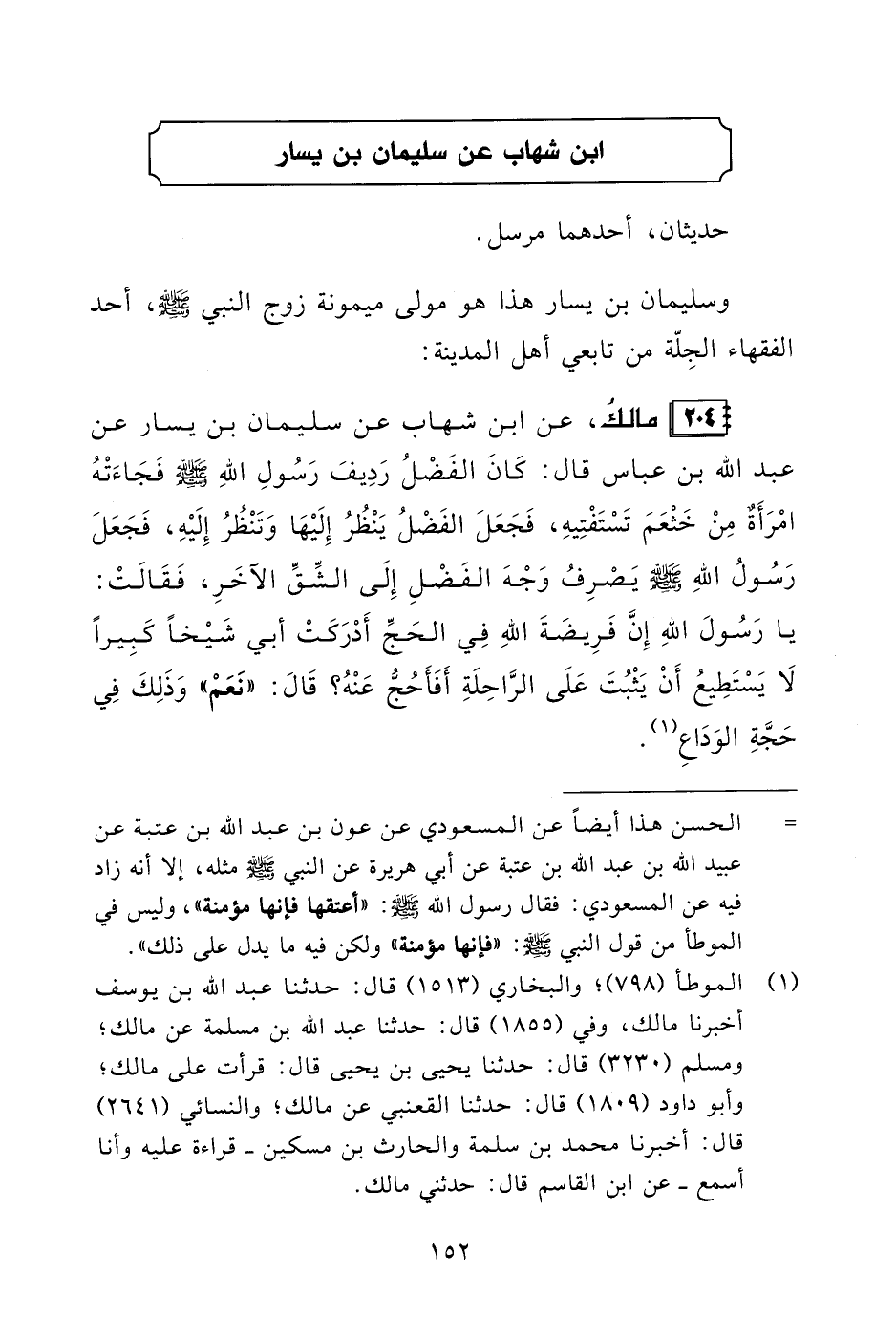 204 - مالكُ، عن ابن شهاب عن سليمان بن يسار عن عبد الله بن عباس قال: كَانَ الفَضْلُ رَدِيفَ رَسُولِ اللهِ - صلى الله عليه وسلم - فَجَاءَتْهُ امْرَأَةٌ مِنْ خَثْعَمَ تَسْتَفْتِيهِ، فَجَعَلَ الفَضْلُ يَنْظُرُ إِلَيْهَا وَتَنْظُرُ إِلَيْهِ، فَجَعَلَ رَسُولُ اللهِ - صلى الله عليه وسلم - يَصرِفُ وَجْهَ الفَضْلِ إِلَى الشِّقِّ الآخَرِ، فَقَالَتْ: يا رَسُولَ اللهِ إِنَّ فَرِيضةَ اللهِ فِي الحَجِّ أَدْرَكَتْ أبي شَيْخًا كَبِيرًا لَا يَسْتَطِيعُ أَنْ يَثْبُتَ عَلَى الرَّاحِلَةِ أَفَأَحُجُّ عَنْهُ؟ قَالَ: "نَعَمْ" وَذَلِكَ فِي حَجَّةِ الوَدَاعِ (¬1).