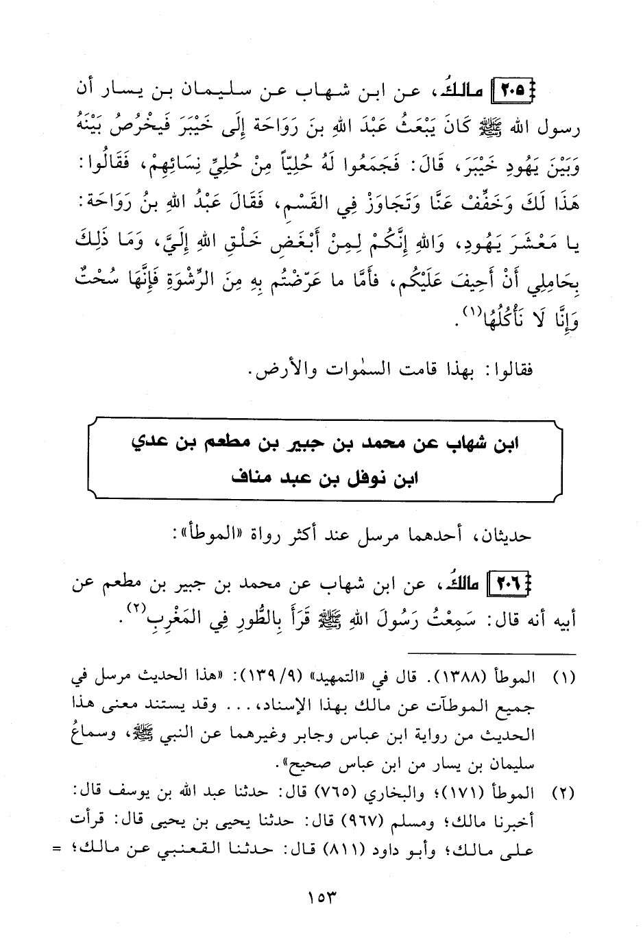205 - مالكُ، عن ابن شهاب عن سليمان بن يسار أن رسول الله - صلى الله عليه وسلم - كَانَ يَبْعَثُ عَبْدَ اللهِ بنَ رَوَاحَة إِلَى خَيْبَرَ فَيخْرُصُ بَيْنَهُ وَبَيْنَ يَهُودِ خَيْبَرَ، قَالَ: فَجَمَعُوا لَهُ حُلِيًّا مِنْ حُلِيِّ نِسَائِهِمْ، فَقَالُوا: هَذَا لَكَ وَخَفِّفْ عَنَّا وَتَجَاوَزْ فِي القَسْمِ، فَقَالَ عَبْدُ اللهِ بنُ رَوَاحَة: يا مَعْشَرَ يَهُودِ، وَاللهِ إِنَّكُمْ لِمِنْ أَبْغَضِ خَلْقِ اللهِ إِلَيَّ، وَمَا ذَلِكَ بِحَامِلِي أَنْ أَحِيفَ عَلَيْكُم، فأَمَّا ما عَرّضْتُم بِهِ مِنَ الرِّشْوَةِ فَإِنَّهَا سُحْتٌ وإنَّا لَا نَأْكُلُهُا (¬1).