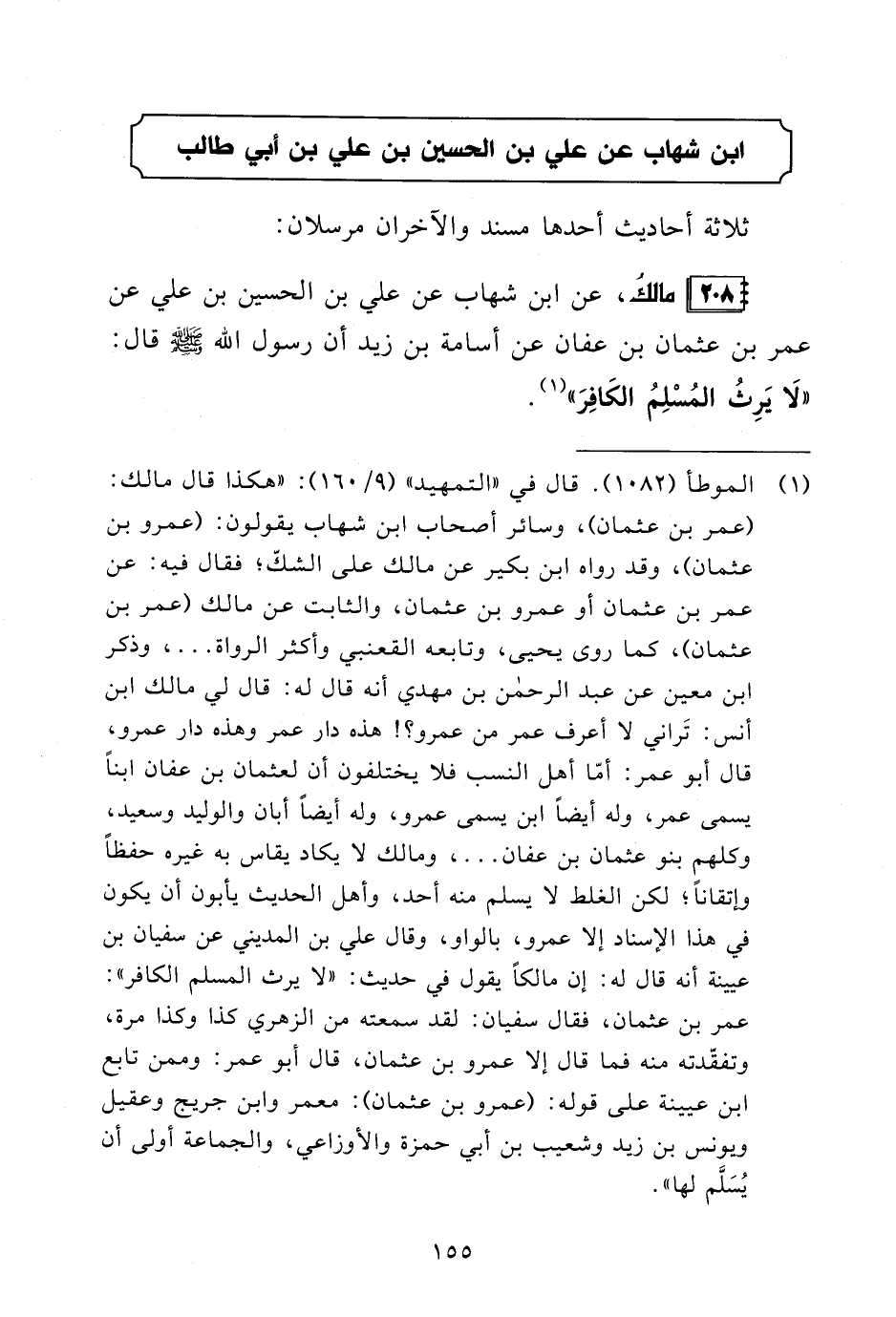208 - مالكُ، عن ابن شهاب عن علي بن الحسين بن علي عن عمر بن عثمان بن عفان عن أسامة بن زيد أن رسول الله - صلى الله عليه وسلم - قال: "لَا يَرِثُ المُسْلِمُ الكَافِرَ" (¬1).