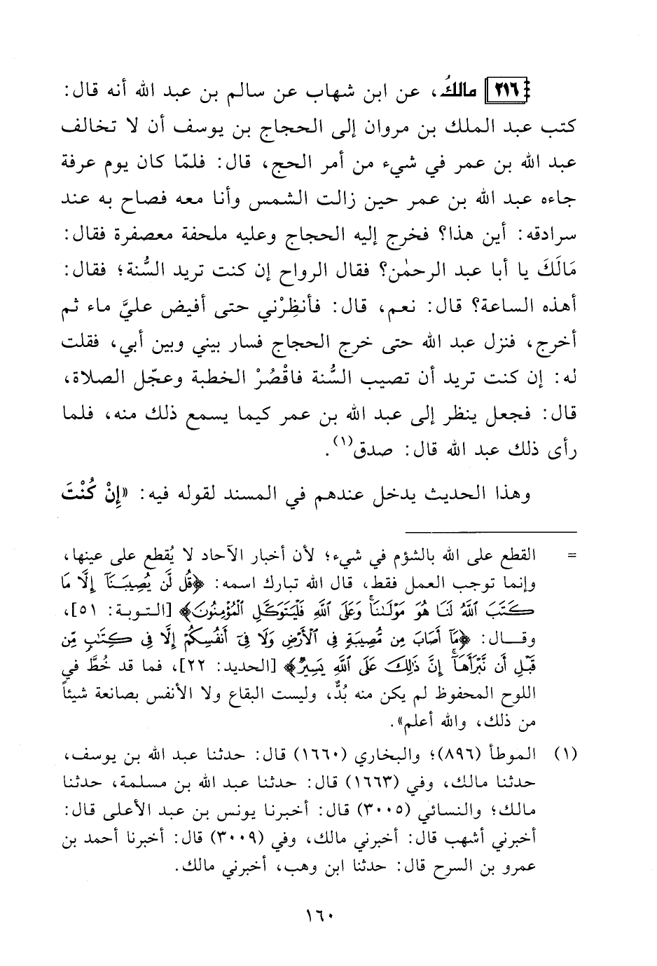 216 - مالكُ، عن ابن شهاب عن سالم بن عبد الله أنه قال: كتب عبد الملك بن مروان إلى الحجاج بن يوسف أن لا تخالف عبد الله بن عمر في شيء من أمر الحج، قال: فلمّا كان يوم عرفة جاءه عبد الله بن عمر حين زالت الشمس وأنا معه فصاح به عند سرادقه: أين هذا؟ فخرج إليه الحجاج وعليه ملحفة معصفرة فقال: مَا لَكَ يا أبا عبد الرحمن؟ فقال الرواح إن كنت تريد السُّنة؛ فقال: أهذه الساعة؟ قال: نعم، قال: فأنظِرْني حتى أفيض عليَّ ماء ثم أخرج، فنزل عبد الله حتى خرج الحجاج فسار بيني وبين أبي، فقلت له: إن كنت تريد أن تصيب السُّنة فاقْصُرْ الخطبة وعجّل الصلاة، قال: فجعل ينظر إلى عبد الله بن عمر كيما يسمع ذلك منه، فلما رأى ذلك عبد الله قال: صدق (¬1).