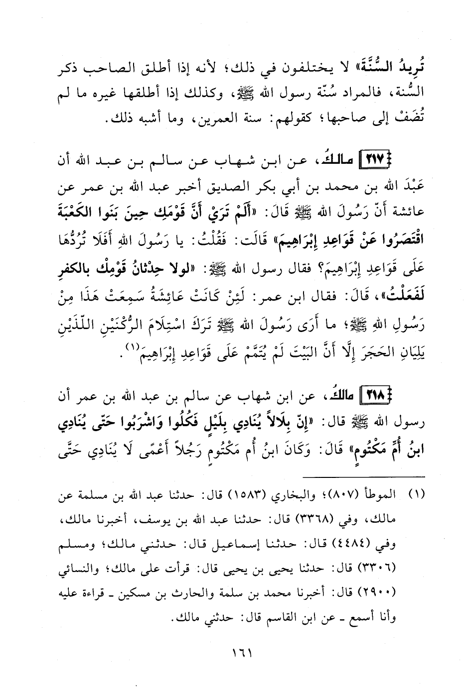 217 - مالكُ، عن ابن شهاب عن سالم بن عبد الله أن عَبْدَ الله بن محمد بن أبي بكر الصديق أخبر عبد الله بن عمر عن عائشة أَنّ رَسُولَ الله - صلى الله عليه وسلم - قَالَ: "ألمْ تَرَيْ أَنَّ قَوْمَكِ حِينَ بَنَوا الكَعْبَةَ اقْتَصَرُوا عَنْ قَوَاعِدِ إِبْرَاهِيمَ" قَالَت: فَقُلْتُ: يا رَسُولَ اللهِ أَفَلَا تُرُدُّهَا عَلَى قَوَاعِدِ إِبْرَاهِيمَ؟ فقال رسول الله - صلى الله عليه وسلم -: "لولا حِدْثانُ قَوْمِكْ بالكفرِ لَفَعَلْتُ"، قَالَ: فقال ابن عمر: لَئِنْ كَانَتْ عَائِشَةُ سَمِعَتْ هَذَا مِنْ رَسُولِ اللهِ - صلى الله عليه وسلم - ما أَرَى رَسُولَ الله - صلى الله عليه وسلم - تَرَكَ استِلَامَ الرُّكْنَيْنِ اللّذَيْنِ يَلِيَانِ الحَجَرَ إِلَّا أَنَّ البَيْتَ لَمْ يُتَمَّمْ عَلَى قَوَاعِدِ إِبْرَاهِيمَ (¬1).