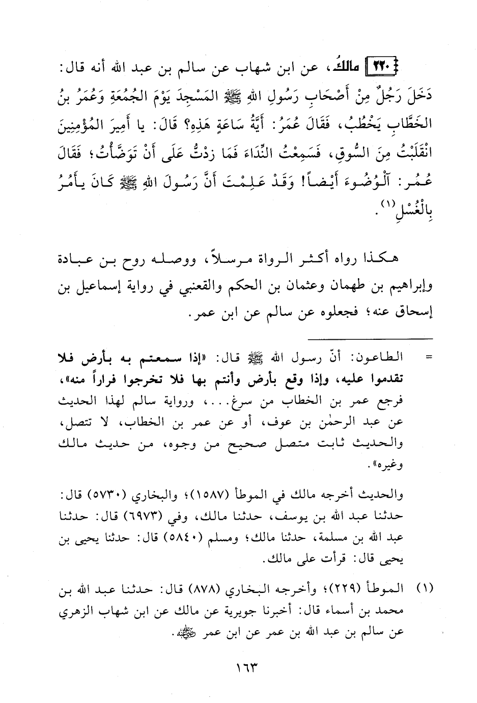 = الطاعون: أنّ رسول الله - صلى الله عليه وسلم - قال: "إذا سمعتم به بأرض فلا تقدموا عليه، وإذا وقع بأرض وأنتم بها فلا تخرجوا فرارًا منه"، فرجع عمر بن الخطاب من سرغ. . .، ورواية سالم لهذا الحديث عن عبد الرحمن بن عوف، أو عن عمر بن الخطاب، لا تتصل، والحديث ثابت متصل صحيح من وجوه، من حديث مالك وغيره".