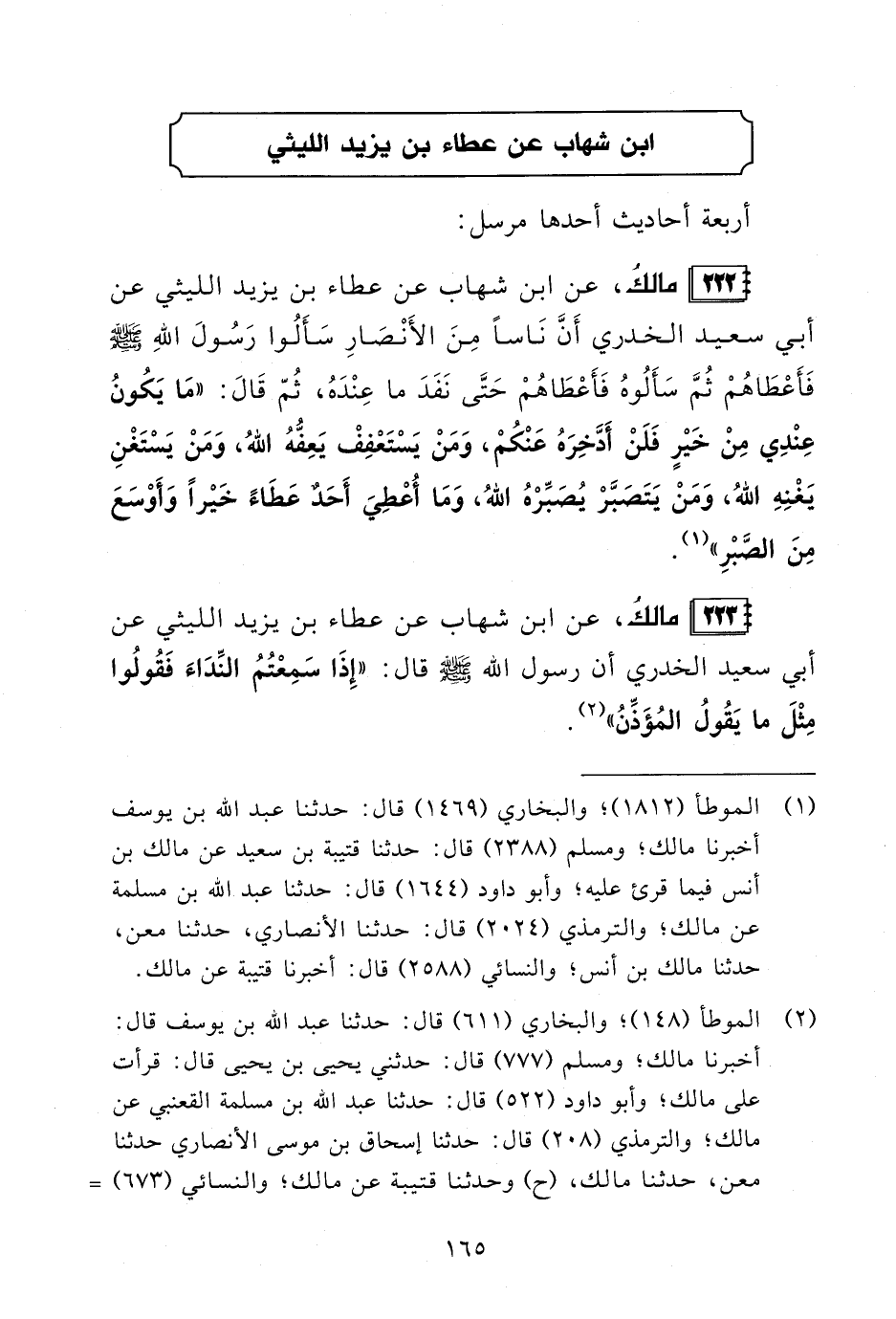 222 - مالكُ، عن ابن شهاب عن عطاء بن يزيد الليثي عن أبي سعيد الخدري أَنَّ نَاسًا مِنَ الأَنْصَارِ سَأَلُوا رَسُولَ اللهِ - صلى الله عليه وسلم - فَأَعْطَاهُمْ ثُمَّ سَأَلُوهُ فَأَعْطَاهُمْ حَتَّى نَفَدَ ما عِنْدَهُ، ثُمّ قَالَ: "مَا يَكُونُ عِنْدِي مِنْ خَيْرٍ فَلَنْ أَدَّخِرَهُ عَنْكُمْ، وَمَنْ يَسْتَعْفِفْ يَعِفُّهُ اللهُ، وَمَنْ يَسْتَغْنِ يَغْنِةِ اللهُ، وَمَنْ يَتَصَبَّرْ يُصَبِّرْهُ اللهُ، وَمَا أُعْطِيَ أَحَدٌ عَطَاءً خَيْرًا وَأَوْسَعَ مِنَ الصَّبْرِ" (¬1).