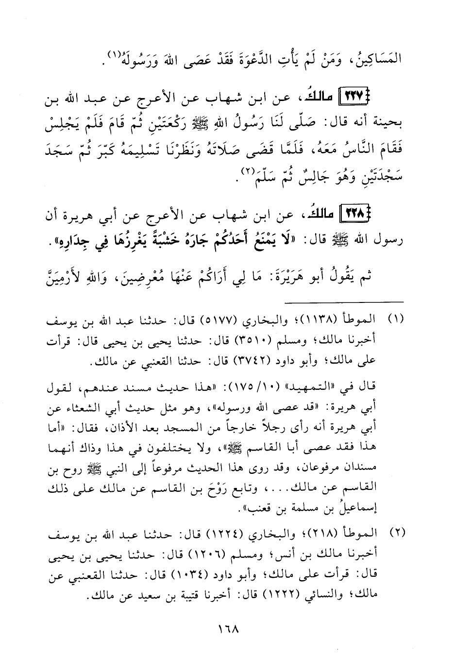 227 - مالكُ، عن ابن شهاب عن الأعرج عن عبد الله بن بحينة أنه قال: صلّى لَنَا رَسُولُ اللهِ - صلى الله عليه وسلم - رَكْعَتَيْنِ ثمّ قَامَ فَلَمْ يَجْلِسْ فَقَامَ النَّاسُ مَعَهُ، فَلَمَّا قَضَى صَلَاتَهُ وَنَظَرْنَا تَسْلِيمَهُ كَبّرَ ثمّ سَجَدَ سَجْدَتَيْنِ وَهُوَ جَالِسٌ ثُمّ سَلَّمَ (¬2).