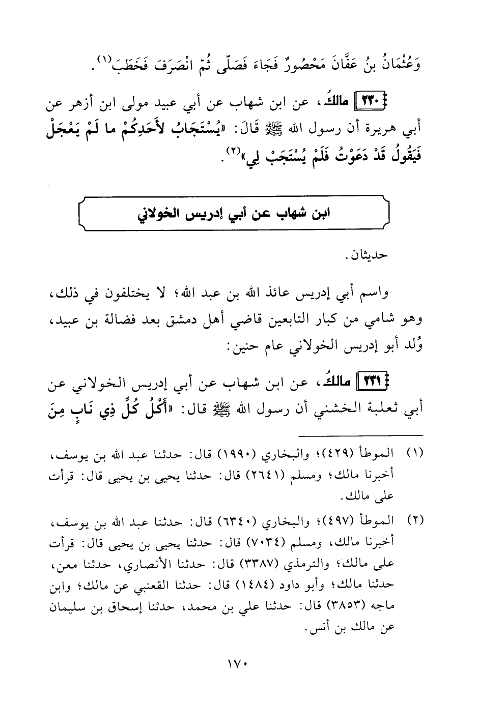231 - مالكُ، عن ابن شهاب عن أبي إدريس الخولاني عن أبي ثعلبة الخشني أن رسول الله - صلى الله عليه وسلم - قال: "أَكْلُ كلِّ ذِي نَابٍ مِنَ