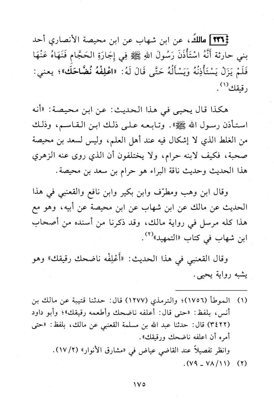 236 - مالكُ، عن ابن شهاب عن ابن محيصة الأنصاري أحد بني حارثة أَنَّهُ اسْتَأْذَنَ رَسُولَ اللهِ - صلى الله عليه وسلم - فِي إِجَارَةِ الحَجَّامِ فَنَهَاهُ عَنْهَا فَلَمْ يَزَلْ يَسْتَأذِنُهُ وَيَسْأَلُهُ حَتَّى قَالَ لَهُ: "اعْلِفْهُ نُضَّاحَكَ"؛ يعني: رقيقك (¬1).