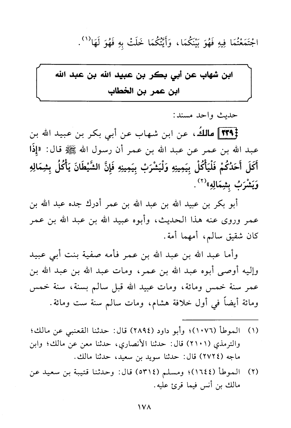 239 - مالكُ، عن ابن شهاب عن أبي بكر بن عبيد الله بن عبد الله بن عمر عن عبد الله بن عمر أن رسول الله - صلى الله عليه وسلم - قال: "إِذَا أَكَلَ أَحَدُكُمْ فَلْيَأْكُلْ بِيَمِينِهِ وَلْيَشْرَبْ بِيَمِينِهِ فَإِنَّ الشَّيْطَانَ يَأْكُلُ بِشِمَالِهِ وَيَشْرَبُ بِشِمَالِهِ" (¬2).