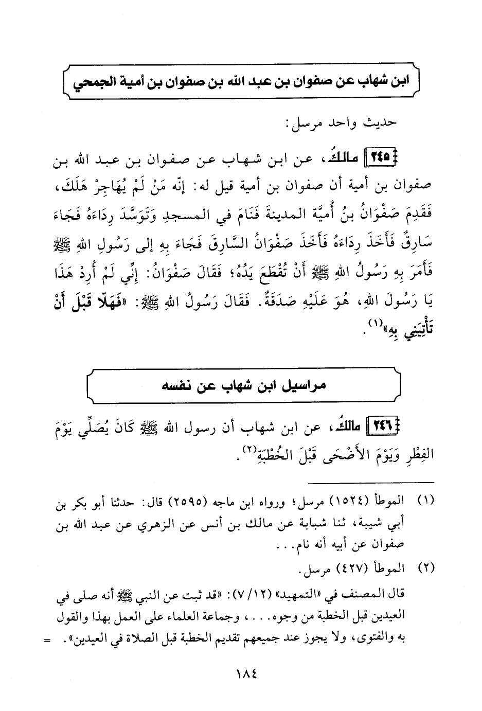 245 - مالكُ، عن ابن شهاب عن صفوان بن عبد الله بن صفوان بن أمية أن صفوان بن أمية قيل له: إنّه مَنْ لَمْ يُهَاجِرْ هَلَكَ, فَقَدِمَ صَفْوَانُ بنُ أُميَّة المدينةَ فَنَامَ في المسجدِ وَتَوَسَّدَ رِدَاءَهُ فَجَاءَ سَارِقٌ فَأَخَذَ رِدَاءَهُ فَأَخَذَ صَفْوَانُ السَّارِقَ فَجَاءَ بِهِ إلى رَسُولِ اللهِ - صلى الله عليه وسلم - فَأَمَرَ بِهِ رَسُولُ اللهِ - صلى الله عليه وسلم - أَنْ تُقْطَعَ يَدُهُ؛ فَقَالَ صَفْوَانُ: إِنِّي لَمْ أُرِدْ هَذَا يَا رَسُولَ اللهِ، هُوَ عَلَيْهِ صَدَقَةٌ. فَقَالَ رَسُولُ اللهِ - صلى الله عليه وسلم -: "فَهَلّا قَبْلَ أَنْ تَأْتِيَنِي بِهِ" (¬1).