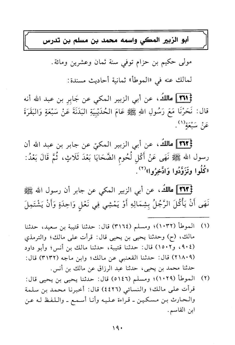 261 - مالكُ، عن أبي الزبير المكي عن جَابِرِ بن عبد الله أنه قال: نَحَرْنَا مَعَ رَسُولِ اللهِ - صلى الله عليه وسلم - عَامَ الحُدَيْبِيَةِ البَدَنَةَ عَنْ سَبْعَةٍ وَالبَقَرَةَ عَنْ سَبْعَةٍ (¬1).