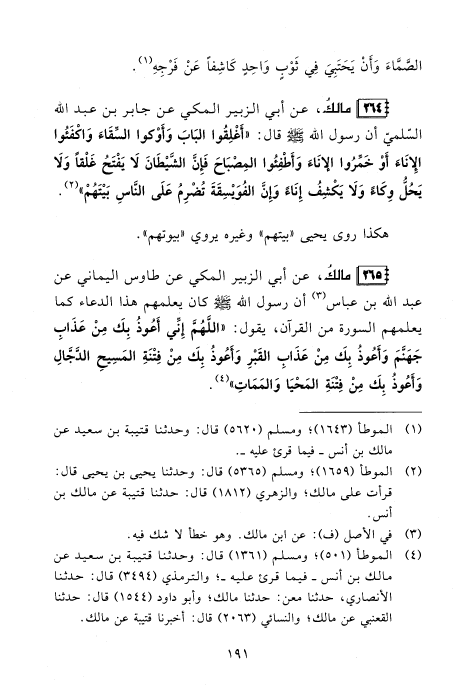 264 - مالكُ، عن أبي الزبير المكي عن جابر بن عبد الله السّلميّ أن رسول الله - صلى الله عليه وسلم - قال: "أَغْلِقُوا البَابَ وَأَوْكوا السِّقَاءَ وَاكْفَئُوا الإِنَاءَ أَوْ خَمِّرُوا الإِنَاءَ وَأَطْفِئُوا المِصْبَاحَ فَإِنَّ الشَّيْطَانَ لَا يَفْتَحُ غَلْقًا وَلَا يَحُلُّ وِكَاءً وَلَا يَكْشِفُ إِنَاءً وَإِنَّ الفُوَيْسِقَةَ تُضْرِمُ عَلَى النَّاسِ بَيْتَهُمْ" (¬2).