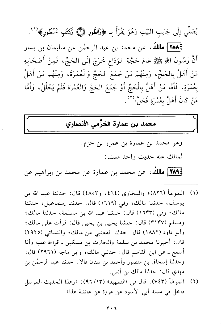 288 - مالكُ، عن محمد بن عبد الرحمن عن سليمان بن يسار أَنَّ رَسُولَ اللهِ - صلى الله عليه وسلم - عَامَ حَجَّةِ الوَدَاعِ خَرَجَ إِلَى الحَجِّ، فَمِنْ أَصْحَابِهِ مَنْ أَهَلَّ بِالحَجِّ، وَمِنْهُمْ مَنْ جَمَعَ الحَجَّ وَالْعُمَرَةَ، وَمِنْهُم مَنْ أَهَلَّ بِعُمْرَةٍ، فَأَمَّا مَن أَهَلَّ بِالْحَجِّ أَوْ جَمَعَ الحَجَّ وَالَعُمْرَة فَلَمْ يَحْلُلْ، وَأَمَّا مَنْ كَانَ أَهَلَّ بِعُمْرَةٍ فَحَلَّ" (¬2).