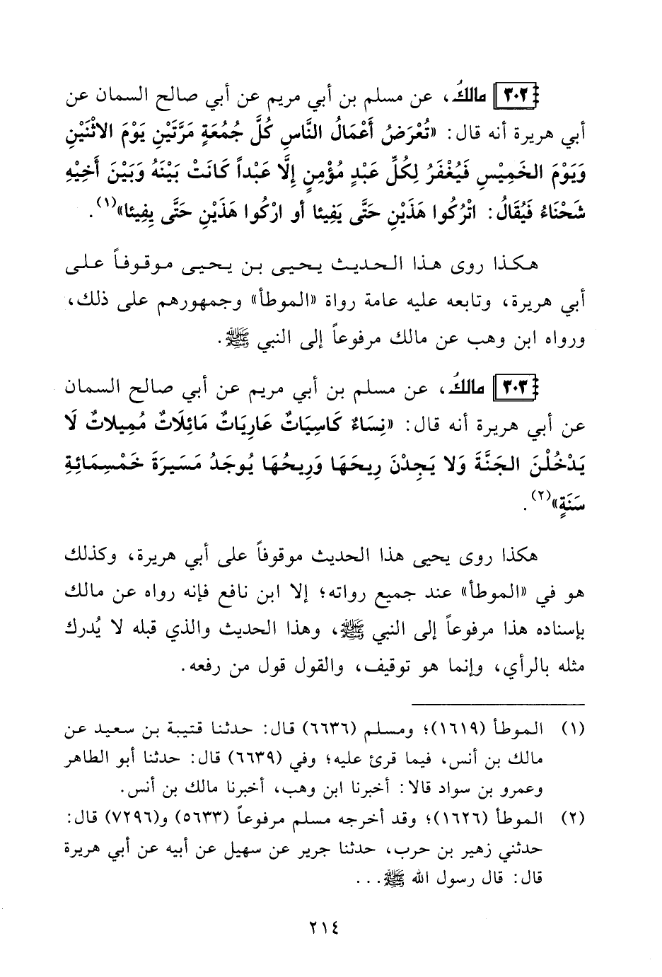 302 - مالكُ، عن مسلم بن أبي مريم عن أبي صالح السمان عن أبي هريرة أنه قال: "تُعْرَضُ أَعْمَالُ النَّاسِ كُلَّ جُمُعَةٍ مَرَّتَيْنِ يَوْمَ الاثْنَيْنِ وَيَوْمَ الخَمِيْسِ فَيُغْفَرُ لِكُلِّ عَبْدٍ مُؤْمِنٍ إِلَّا عَبْدًا كَانَتْ بَيْنَهُ وَبَيْنَ أَخِيْهِ شَحْنَاءُ فَيُقَالُ: اتْرُكُوا هَذَيْنِ حَتَّى يَفِيئا أو ارْكوا هَذَيْنِ حَتَّى يِفِيئا" (¬1).