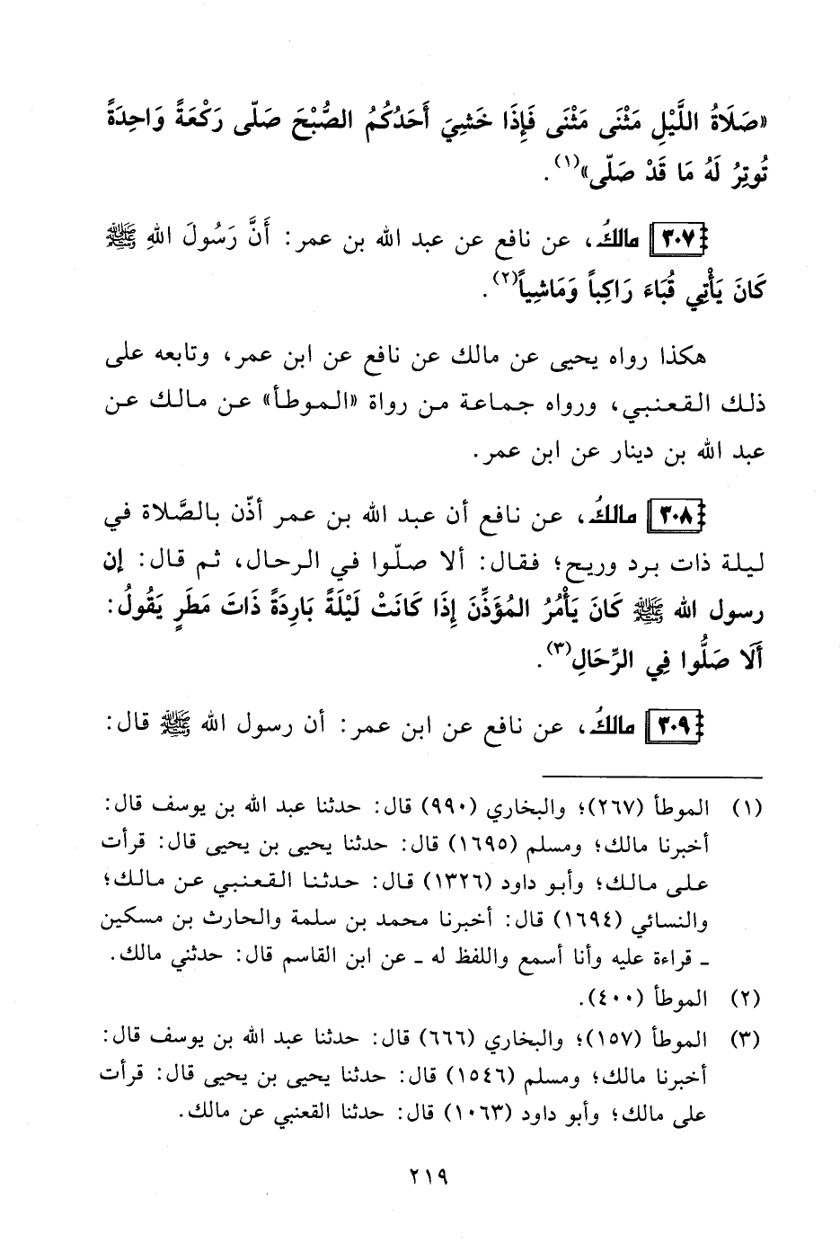 (¬3) الموطأ (157)؛ والبخاريُّ (666) قال: حدثنا عبد الله بن يوسف قال: أخبرنا مالك؛ ومسلمٌ (1546) قال: حدثنا يحيى بن يحيى قال: قرأت على مالك، وأبو داود (1063) قال: حدثنا القعنبي عن مالك.