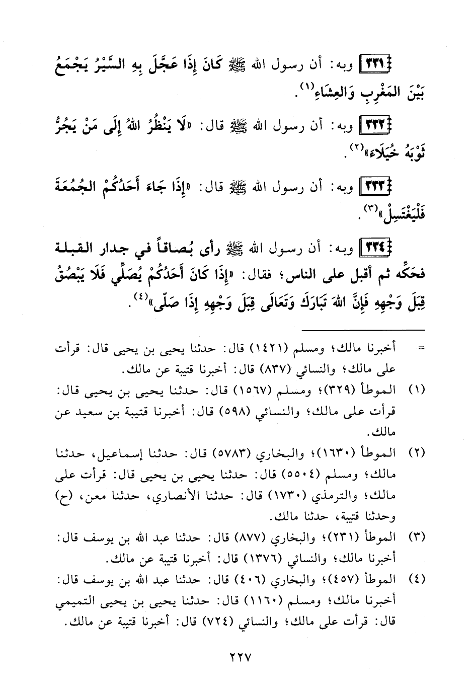 (¬4) الموطأ (457)؛ والبخاريُّ (406) قال: حدثنا عبد الله بن يوسف قال: أخبرنا مالك؛ ومسلمٌ (1160) قال: حدثنا يحيى بن يحيى التميمي قال: قرأت على مالك؛ والنسائيُّ (724) قال: أخبرنا قتيبة عن مالك.