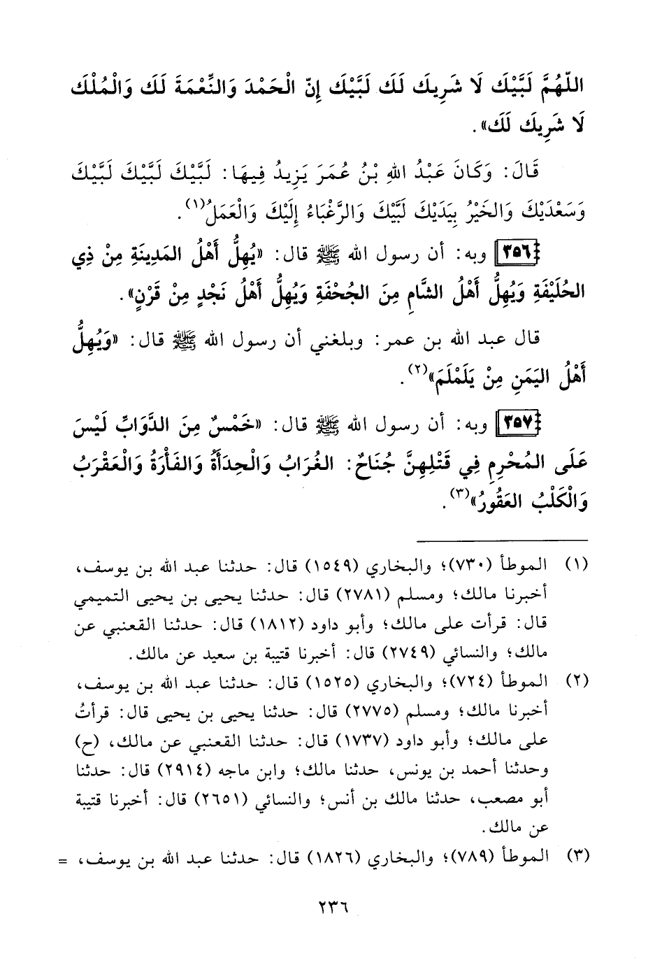 (¬1) الموطأ (730)؛ والبخاريُّ (1549) قال: حدثنا عبد الله بن يوسف، أخبرنا مالك؛ ومسلمٌ (2781) قال: حدثنا يحيى بن يحيى التميمي قال: قرأت على مالك؛ وأبو داود (1812) قال: حدثنا القعنبي عن مالك؛ والنسائيُّ (2749) قال: أخبرنا قتيبة بن سعيد عن مالك.